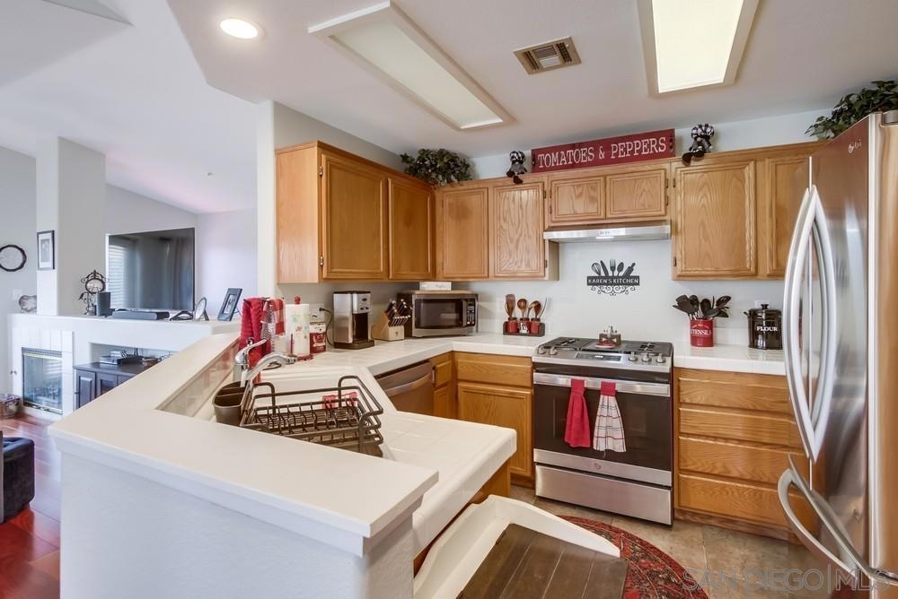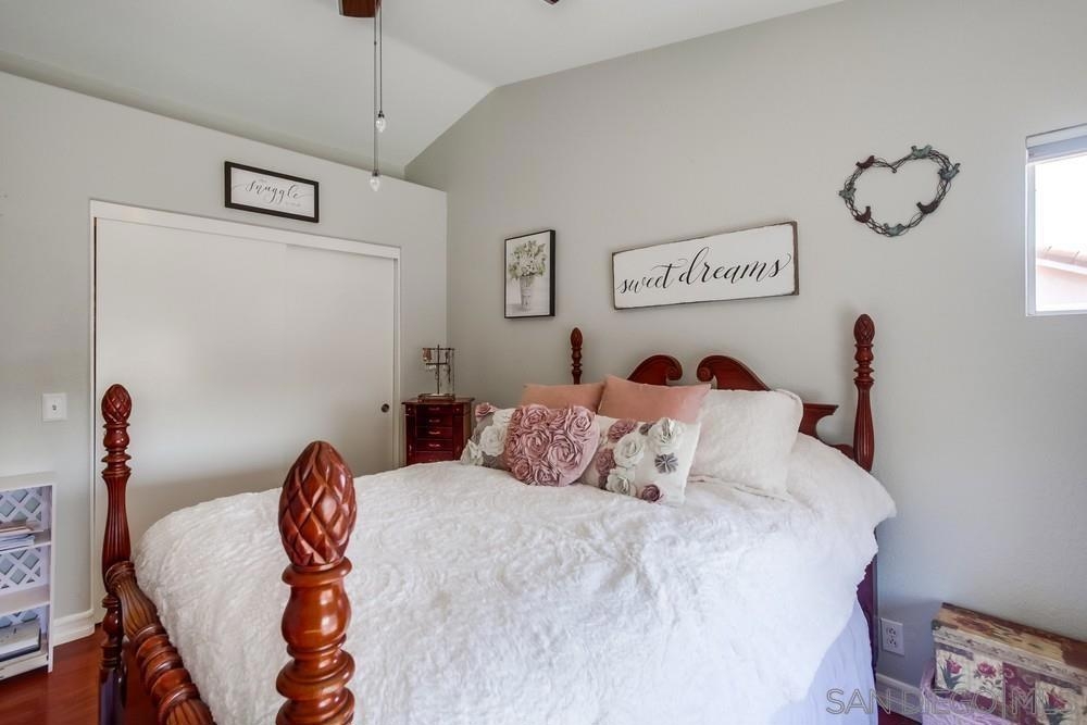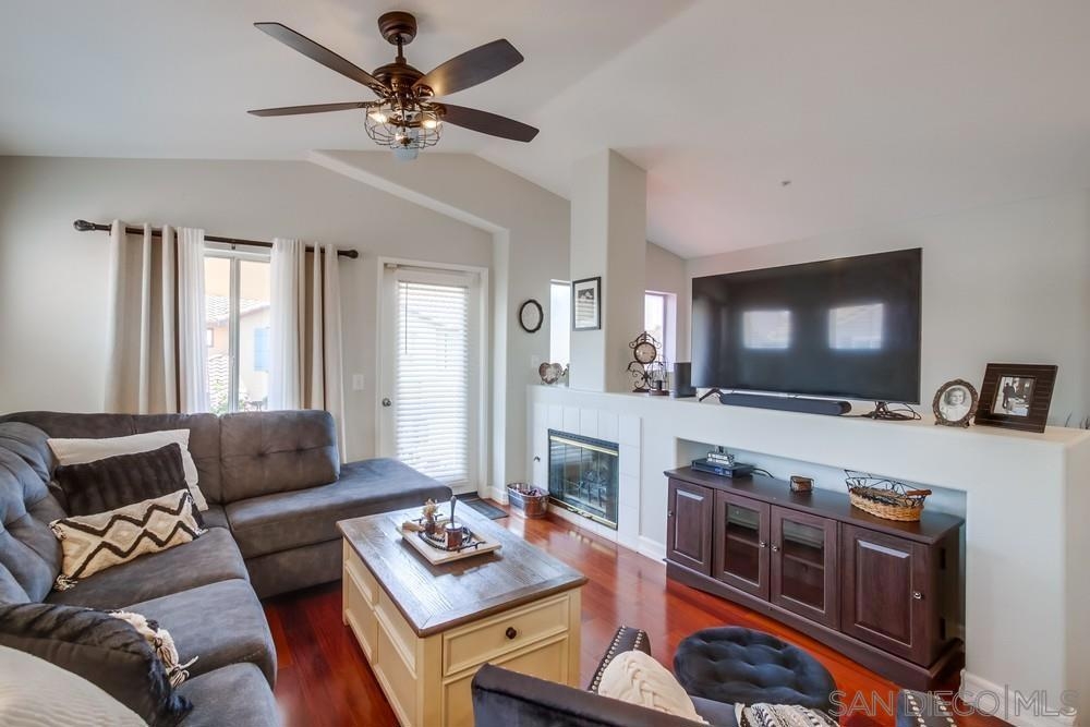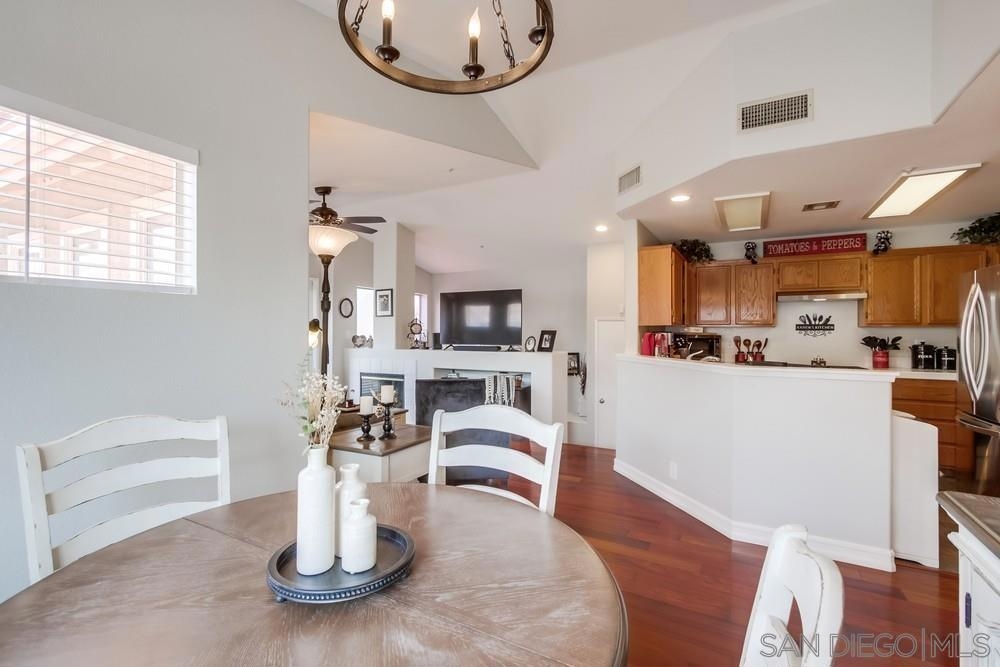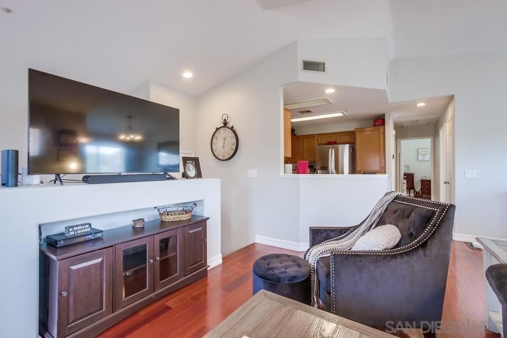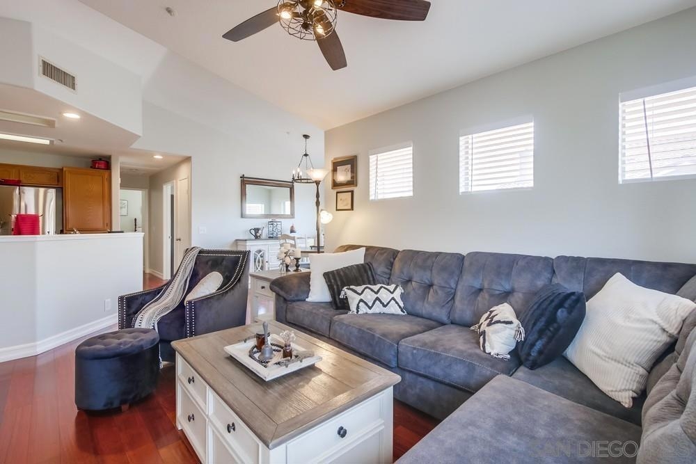 PRICED TO SELL!! LOWEST $$ 2/2 WITH 2 CAR GARAGE IN SANTEE!!! Welcome to this Beautifully Upgraded 2-Bedroom, 2-Bath Condo in the Heart of Santee. This home is in the highly sought after complex of California Mariposa. This 2-story corner unit is perfectly situated in a prime location. Upon entry, a striking cherry wood staircase leads to a light-filled living room featuring Vaulted ceilings, an open floor plan, and elegant cherry hardwood flooring throughout the home. Designer ceiling fans, faux wood blinds, and abundant natural light enhance the home’s warm, inviting feel. A cozy gas fireplace anchors the living space, creating a perfect setting for relaxation or entertaining. The dining area flows seamlessly into the kitchen, which is perfect for gatherings and everyday living. The kitchen boasts of newer stainless-steel appliances, recessed lighting, tile countertops and flooring, plus rich wood cabinetry. The master bedroom includes its own private bath, while the second bedroom is equally spacious. A hallway bath offers a shower/tub combination for added convenience. The HVAC system was replaced approximately 5 years ago offering comfort and peace of mind. From the living room, step out onto the inviting balcony—perfect for enjoying your morning coffee or relaxing after a long day. The finished garage offers an automatic roll-up door, workbench, storage space, and laundry hookups. Community amenities include a sparkling pool, spa, and playground. It is conveniently located within walking distance to shopping, dining, parks, trails, schools and freeways!