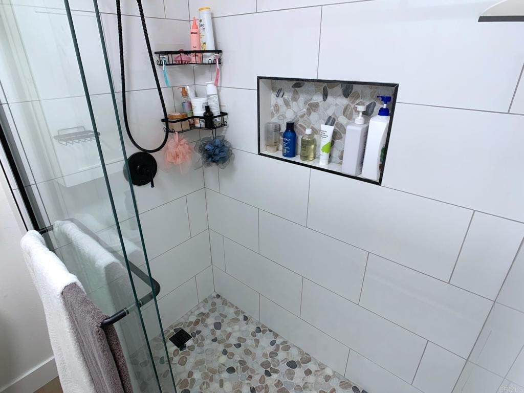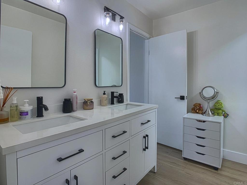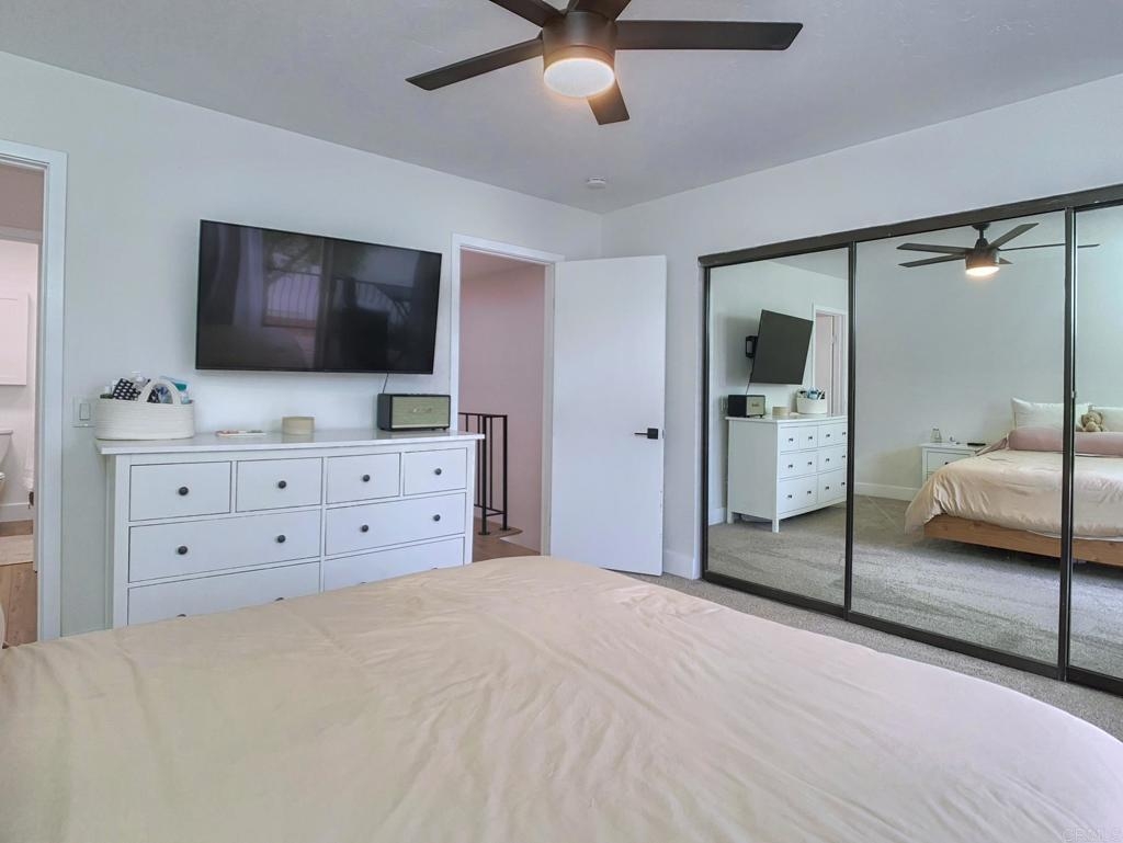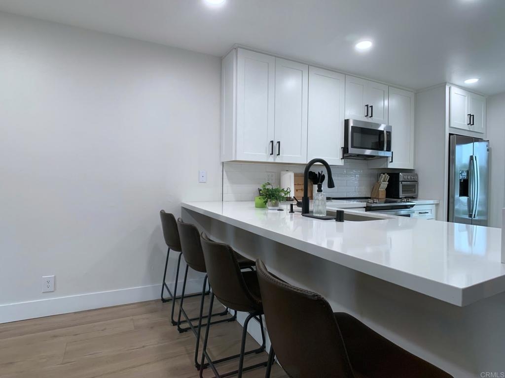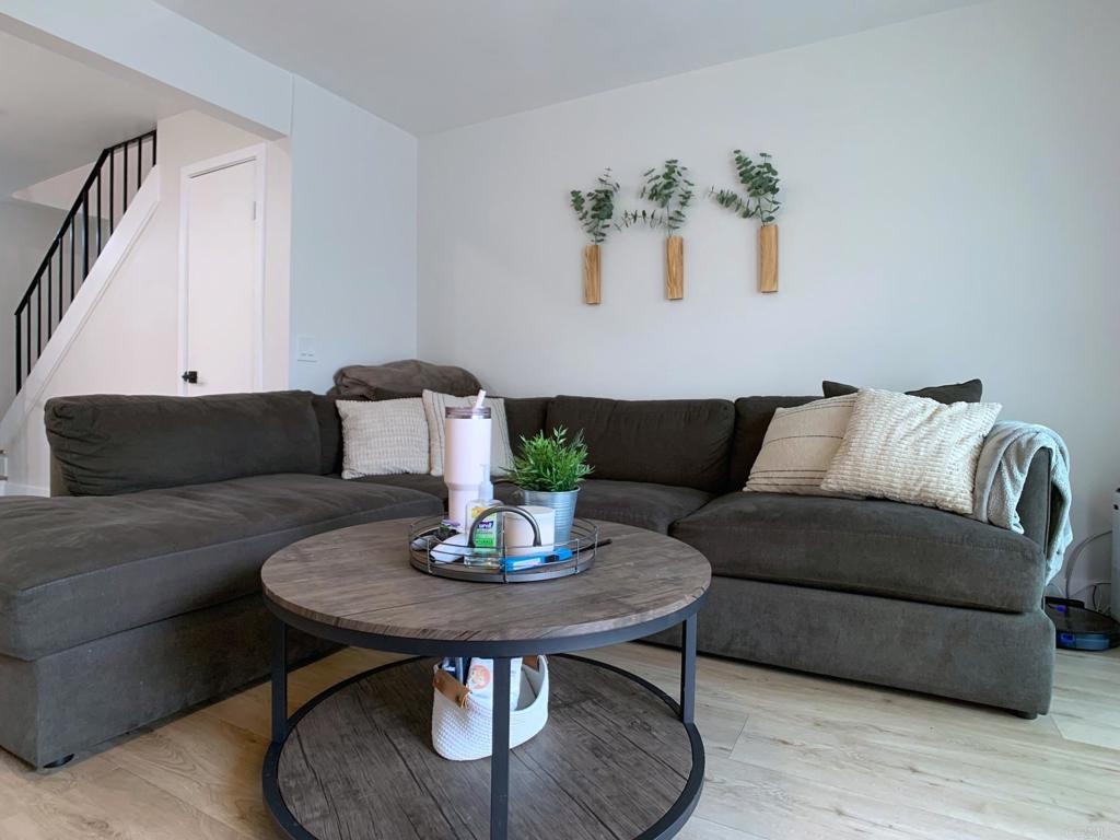 Gorgeous two-story end-unit townhome in Santee!, This one has it all! Lovingly remodeled over the last two years, including, kitchen cabinets, quartz kitchen countertops, stainless appliances, vinyl plank flooring, vinyl windows, lighting, ceiling fans, fireplace mantel and tile, bathroom vanities and tile shower, smart thermostat…must see, too many upgrades to list! Home includes central HVAC, full size laundry closet, and individual water heater. Two upstairs bedrooms with a full bath and a half bath downstairs. This home has just one shared wall, a private, pet friendly patio with upgraded vinyl fencing which flows off the living room and a balcony off the primary bedroom. The property includes one reserved, covered parking space and extra open space parking. Located near Santee Lakes, Carlton Oaks, Mast Park and San Diego River Trails. Easy access to Highway 52, beaches and downtown SD. VA Ok!