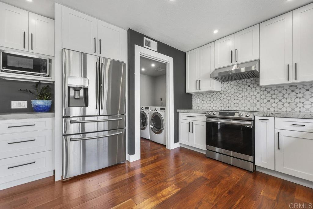 BOM! Welcome to this stunning 2-bedroom, 1.5-bath condo offering over 1,100 square feet of completely renovated living space and a 2-car garage! Step inside to discover elegant acacia floors in the main living space, enhanced by new recessed lighting. The home boasts a new furnace and AC unit, custom West Elm vanity/mirror in the downstairs bath, new molding, and shelving. The kitchen is a chef's dream, featuring a new cabinet system, an updated layout, modern hardware, and quartzite countertops. Enjoy cooking with top-of-the-line appliances including a Samsung smart electric range, Kraus double stainless steel sink, and beautiful SS refrigerator and microwave. Additional highlights include a reverse osmosis water system, pendant light, and an over-range vent hood. In-unit laundry is a breeze with an LG electric washer and dryer. This home is part of a beautiful community with a pool and a low HOA of just $276 a month, it also covers trash. In addition to the two car garage you get 1 additional parking space anywhere in the community, not to mention all of the street parking! Don't miss the chance to own this exceptional property in Santee.