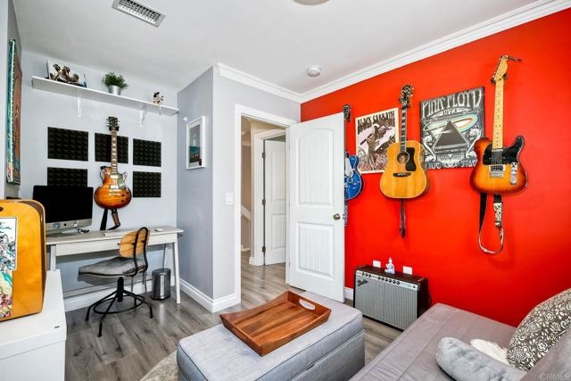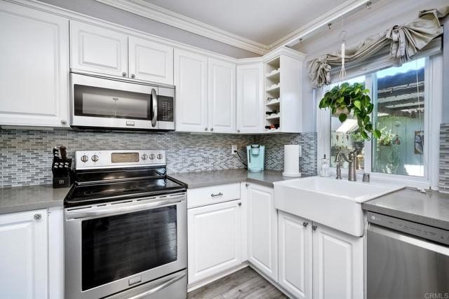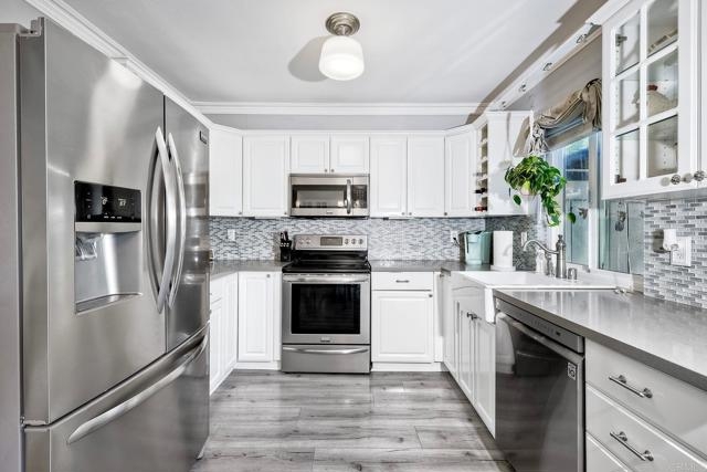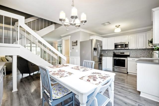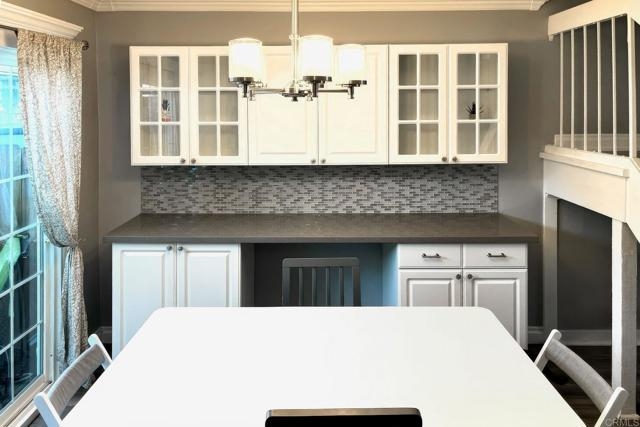 Beautifully updated - new wood floors, crown molding, paint, lights, counter tops, kitchen cabinets, stainless steel appliances, windows, paneling, ceiling fans, A/C, custom cabinets in dining room and glass backsplash, new vanities and lighting in bathrooms, Enjoy the beautiful patio and the detached one car garage. All bedrooms upstairs. Front door faces EAST. HOA amenities include pool, spa, and playground.