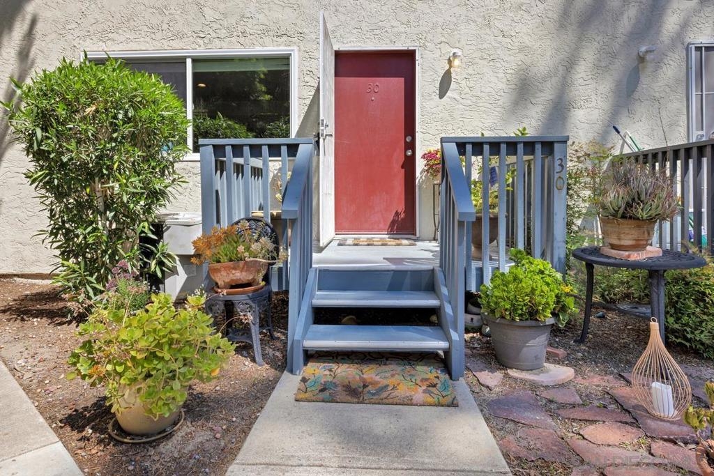 Tucked away in a peaceful corner of a serene, well-kept community, this spacious, highly upgraded, and sunlit end-unit townhome offers the perfect blend of comfort, charm, and convenience. With only one shared wall and no one above or below, you’ll enjoy the quiet and privacy of a single-family feel, surrounded by nature and views of surrounding mountains. Step inside and feel welcomed by a bright open-concept living space, where all newer dual pane windows, sleek tiled floors and recessed lighting lead you into a generously sized living room anchored by a cozy fireplace — the perfect place to unwind after a day of exploring nearby trails. The adjacent dining area flows seamlessly into a large, thoughtfully designed kitchen, featuring rich cabinetry with abundant storage, granite countertops, bar seating and a double sink overlooking the outdoors. Slide open the door to your private balcony, an ideal morning coffee spot with views of the neighboring mountains. Upstairs, retreat to a spacious primary bedroom with an ensuite bathroom and a walk-in shower, and an ample secondary bedroom and bathroom. The home also features a conveniently located laundry closet with stacked washer and dryer, one assigned covered carport space, and access to the community pool. The HOA fee covers water, sewer, and trash, and the balcony will be receiving new wood paneling. In an unbeatable location, with easy freeway access, just minutes from Mission Trails Regional Park, Cowles Mountain, and a variety of lakes, schools, shopping, and dining.