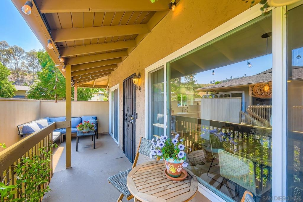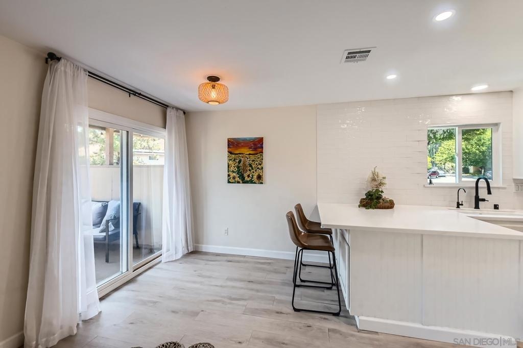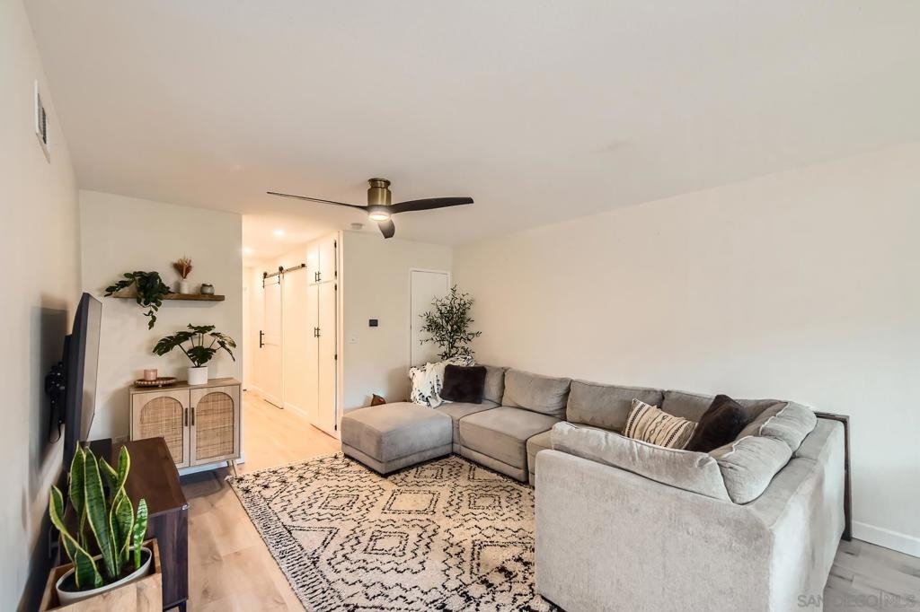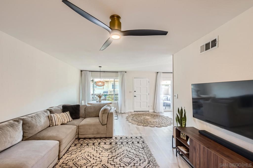 Step into light-filled style and comfort in this beautifully updated 2-bedroom upper-level End Unit condo — perfect for first-time buyers, downsizers craving ease, or investors seeking a move-in ready rental. Located in the heart of Santee, this home offers the ultimate blend of warmth, function, and modern touches. Inside, you'll love the open-concept layout with vinyl flooring, upgraded ceiling fans, and abundant natural light streaming through dual-pane windows. The fresh white kitchen opens seamlessly to a cozy dining nook with designer pendant lighting and peaceful greenbelt views. The second bedroom is currently styled as a sweet nursery but easily transitions into a guest room or home office. Retreat to the spacious primary bedroom featuring a walk-in closet with built-in organization — a rare and practical perk! The updated bathroom boasts neutral finishes and a sleek, modern vibe. Enjoy your own private patio or soak up the sun at the nearby sparkling pool. With a 1-car garage(shared), an additional assigned parking spot, low HOA fees, this VA-approved home is an easy yes. Ideally located near schools, shops, dining, and freeway access, this is the lock-and-leave lifestyle you've been waiting for. Welcome home to Fletcher Valley Villas — where ease meets style in one perfect package.