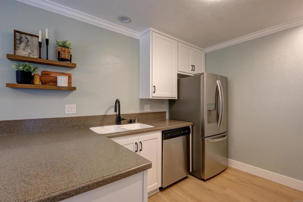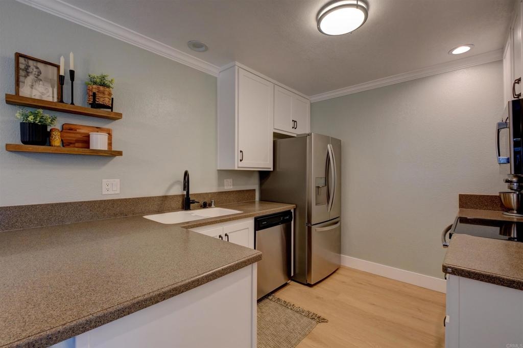 Welcome to this rare, beautifully maintained and recently renovated one-story condo, featuring 3 spacious bedrooms and 2 modern bathrooms-completely move in ready! This charming Home includes a host of desirable features such as fully paid-for solar panels, newer kitchen cabinets, a cozy fireplace in the family room, and plantation shutters on all bedroom windows. Enjoy luxury vinyl wood plank flooring throughout the main areas, with plush carpet in all three bedrooms for added comfort. A stylish barn door adds a modern touch to the hallway bathroom. Additional highlights include, Nest thermostat, Ring doorbell that records both the video and audio, can lighting, 2 car garage, updated windows, in unit laundry, and elegant wide baseboards and crown molding. Enjoy the open-concept layout of this inviting Condo, featuring an enclosed patio just off the kitchen-perfect for outdoor dining or relaxing. A convenient gate from the patio leads directly to your private 2-car garage. All appliances are included, making your move seamless. Nestled in a peaceful, park-like setting, this home offers close access to freeways, restaurants, gyms, shopping, and top-rated schools-combing tranquility with everyday convenience.