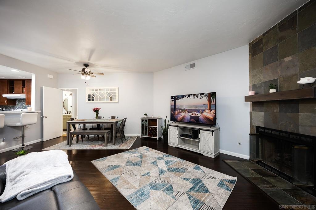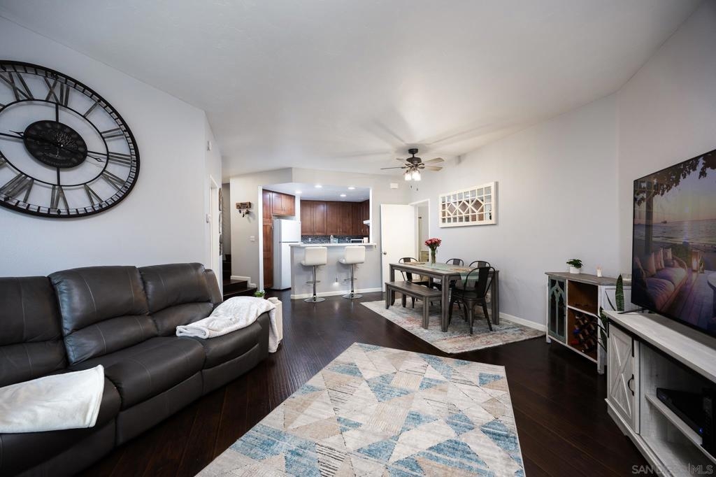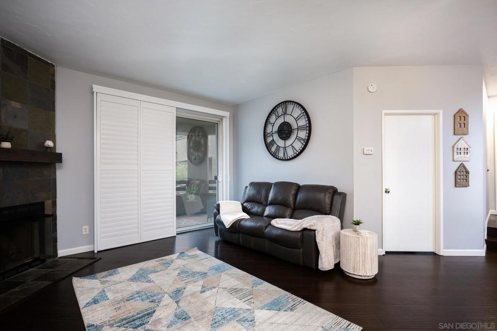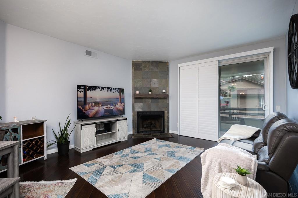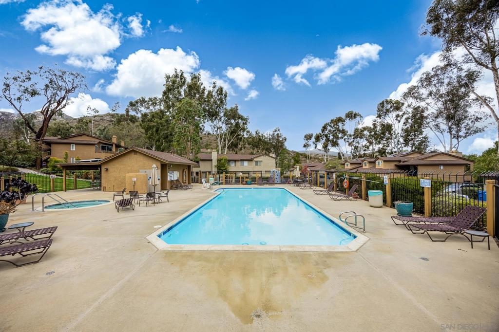 Discover this beautifully updated townhome in the west foothills of Santee, offering modern style and convenience! This 2-bedroom, 2-bathroom home is designed for comfort, with bedrooms positioned on opposite sides of the unit, creating a dual primary suite feel—ideal for privacy. Featuring hard flooring throughout, a stylish tiled fireplace, and a bright, open layout, this home exudes contemporary charm. The updated kitchen boasts newer cabinets, natural stone countertops, and ample storage, making it perfect for home chefs. Enjoy the convenience of an attached one-car garage equipped with an EV charger, as well as a washer and dryer. The home also provides two additional assigned parking spaces! Step outside to your large private patio, which overlooks a lush green space, providing a peaceful retreat. With community amenities like a swimming pool, spa, playground and your own access to mission trails hiking trails this property provides it all!