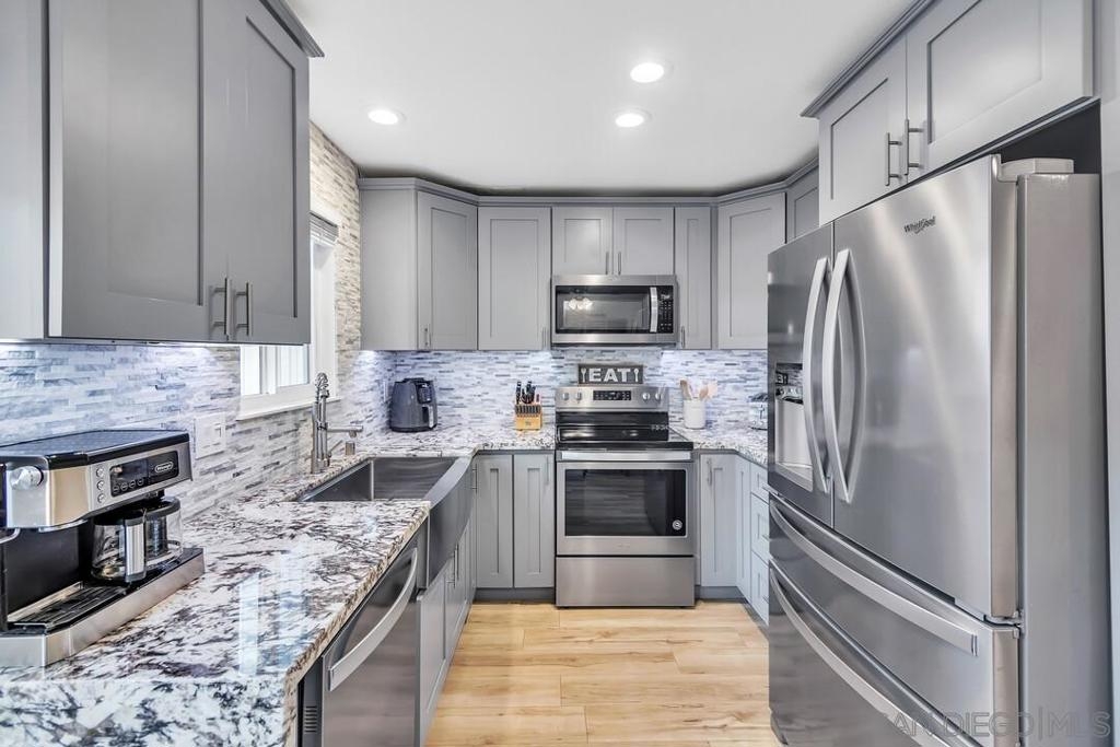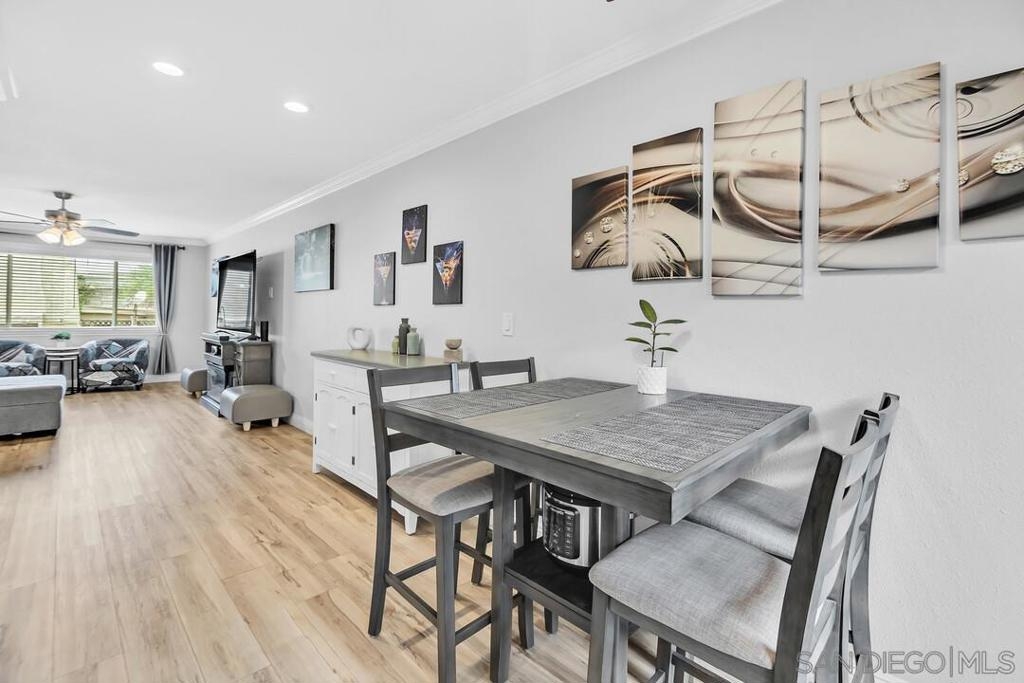 Welcome to this stunningly updated home in Santee! Step inside to discover newly laid flooring that seamlessly extends throughout each spacious room, complemented by ceiling fans, modern lighting, and a fresh coat of paint. Elegant crown molding and sophisticated interior doors add a luxurious touch to these spaces. The contemporary kitchen, equipped with sleek stainless-steel appliances, stylish cabinetry, and under-cabinet lighting, awaits to ignite your culinary creativity. Fully renovated bathrooms boast modern fixtures and chic vanities, elevating the home's appeal. This extensively upgraded home includes a new electric box, dual pane windows, and fully finished closets. Step out through the double doors onto the meticulously finished patio, featuring a freshly stained redwood fence, tile flooring, and an upgraded, full-sized washer and dryer closet. Ample storage space, including a micro space with a pull-down ladder, ensures convenience. Nestled within a community offering a sparkling pool and covering hot water, sewer, and trash utilities, this unit embodies convenience and luxury. With its impressive array of features, this home stands out as a must-see gem. Broker and Broker's Agents do not represent or guarantee accuracy of the square footage, permitted or un-permitted space, bd/ba count, lot size/dimensions, schools, or other information concerning the conditions or features of the property. Buyer is advised to independently verify the accuracy of all information through personal inspection & w/ appropriate professionals to satisfy themselves.