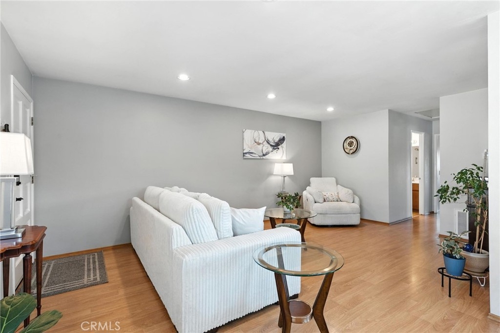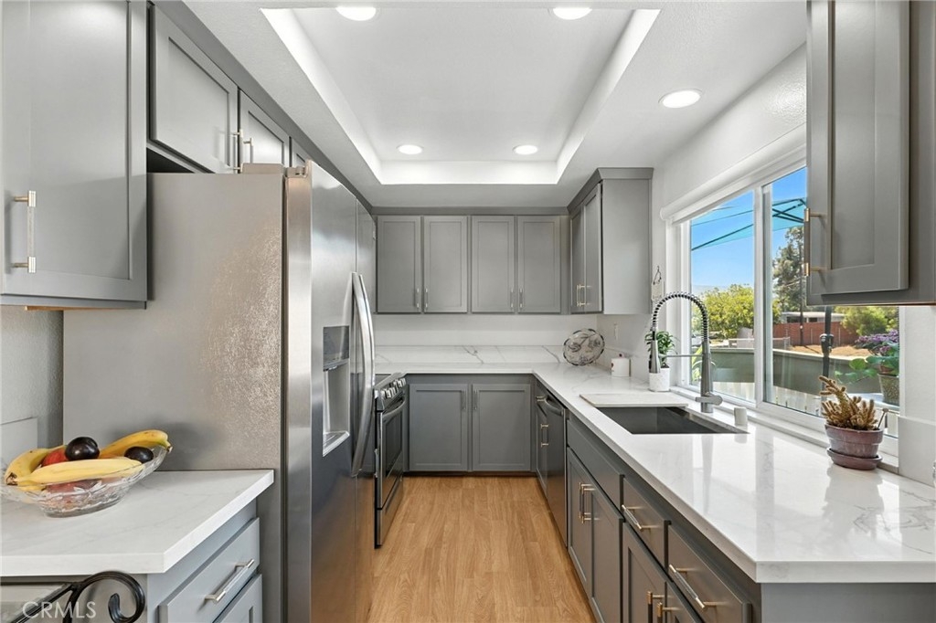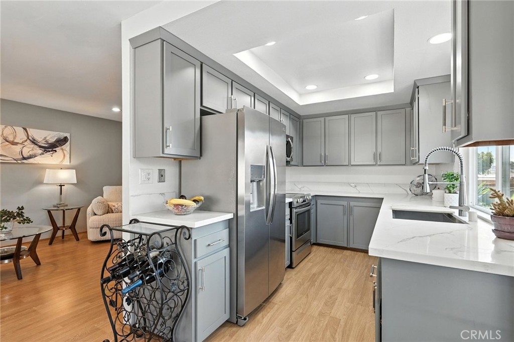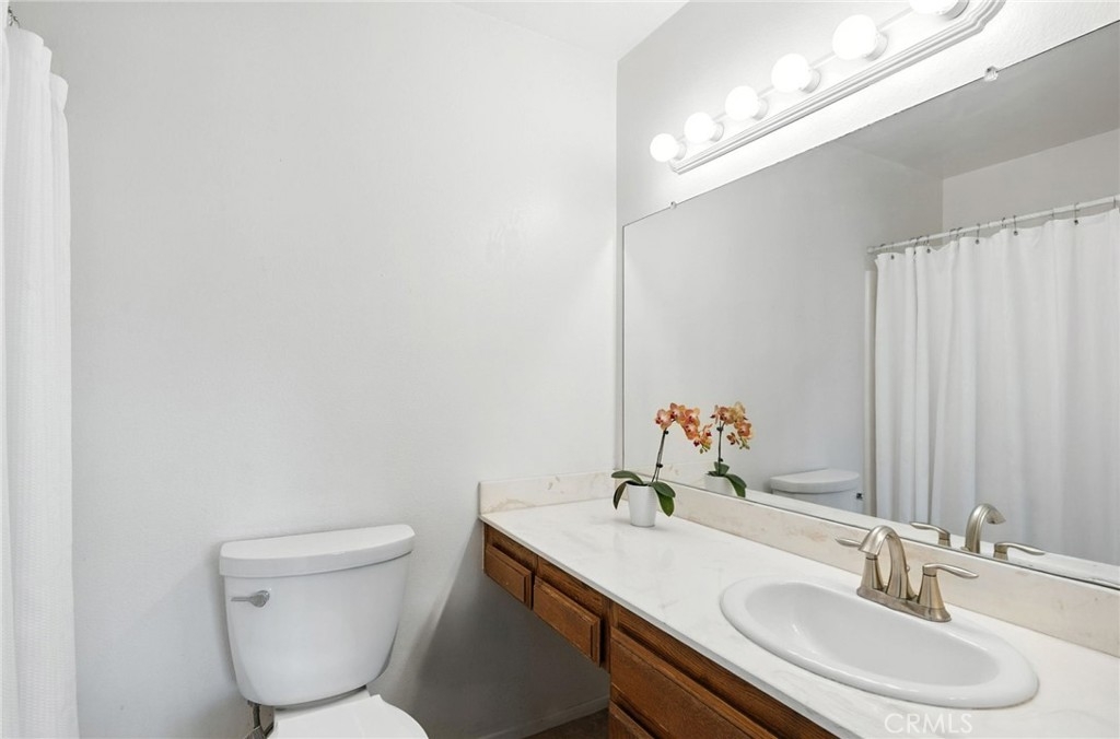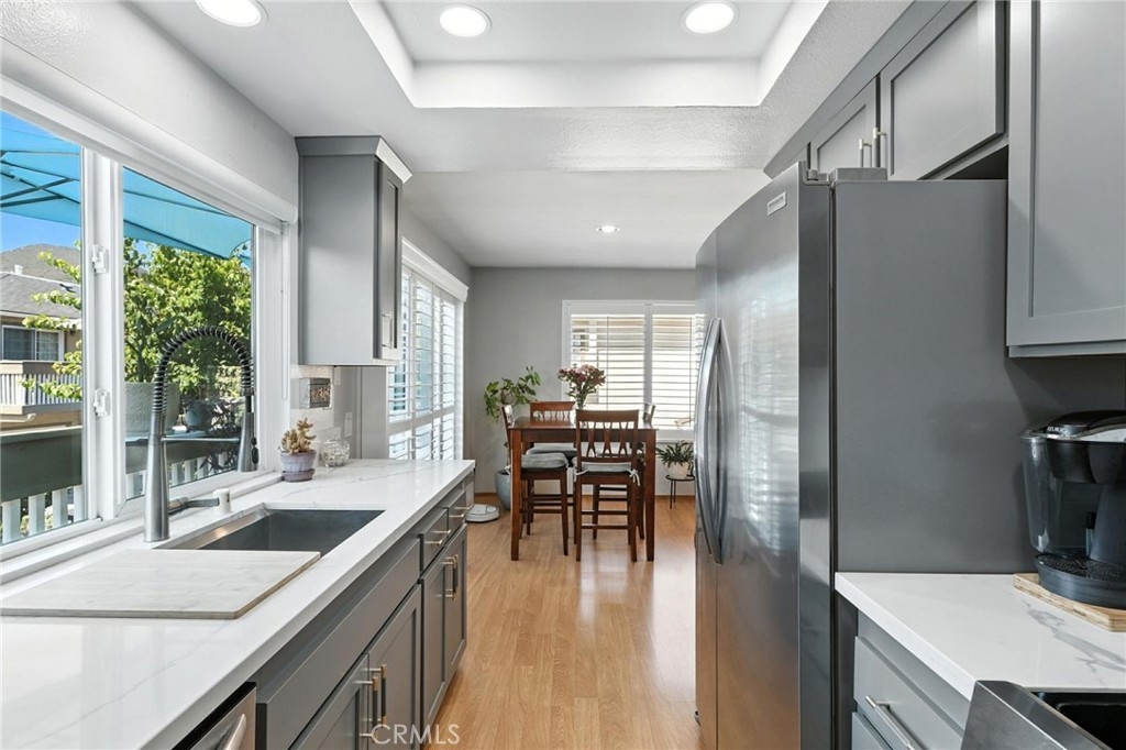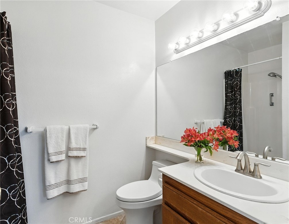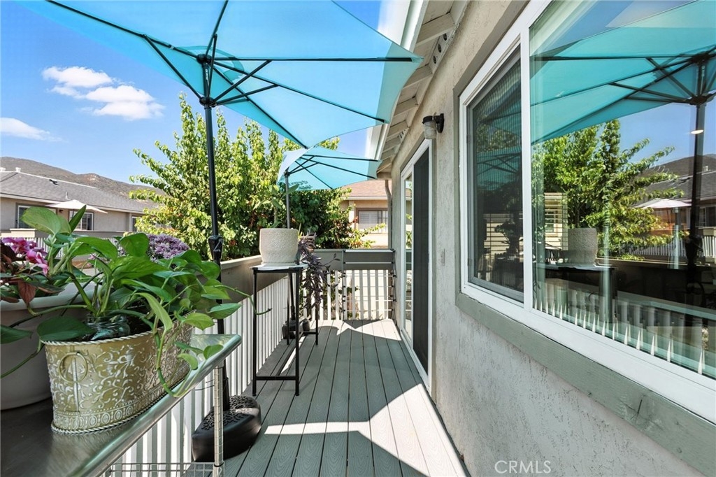 Welcome to Crossway Ct! This charming upper-unit condo is located in the Mission Martinique community and has been recently renovated, making it turnkey. This warm and inviting home features 2 bedrooms, 2 bathrooms, and 945 sq. ft. of living space, along with a one-car garage. The kitchen has been recently updated with gorgeous cabinetry that offers ample storage, including self-closing cabinets and drawers. It boasts modern quartz countertops and stainless-steel appliances, with the refrigerator included in the sale. The kitchen also features a tray ceiling and recessed lighting. Adjacent to the kitchen, the dining area provides slider access to a spacious balcony that is larger than average. Laminate flooring flows seamlessly into the living area. The primary bedroom includes a walk-in closet and an en-suite bathroom with a tub/shower, new toilet, and new fixtures. The secondary bedroom is located across from the guest bathroom, which features a shower and includes a stackable washer and dryer included in the sale. Additional upgrades include new slider and dual-pane windows throughout, new plantation shutters, and a new HVAC system. The one-car garage is directly below the unit and has a new garage door. The community pool is nearby for your enjoyment. Come check out this turnkey home!