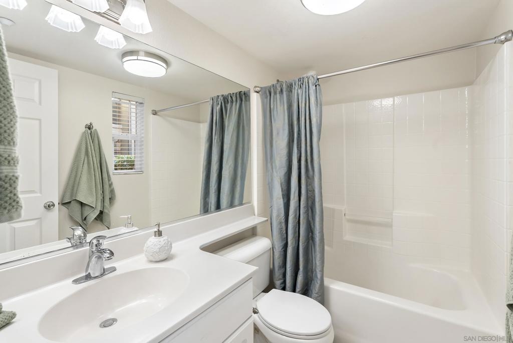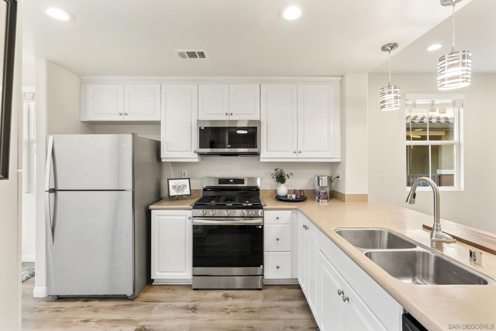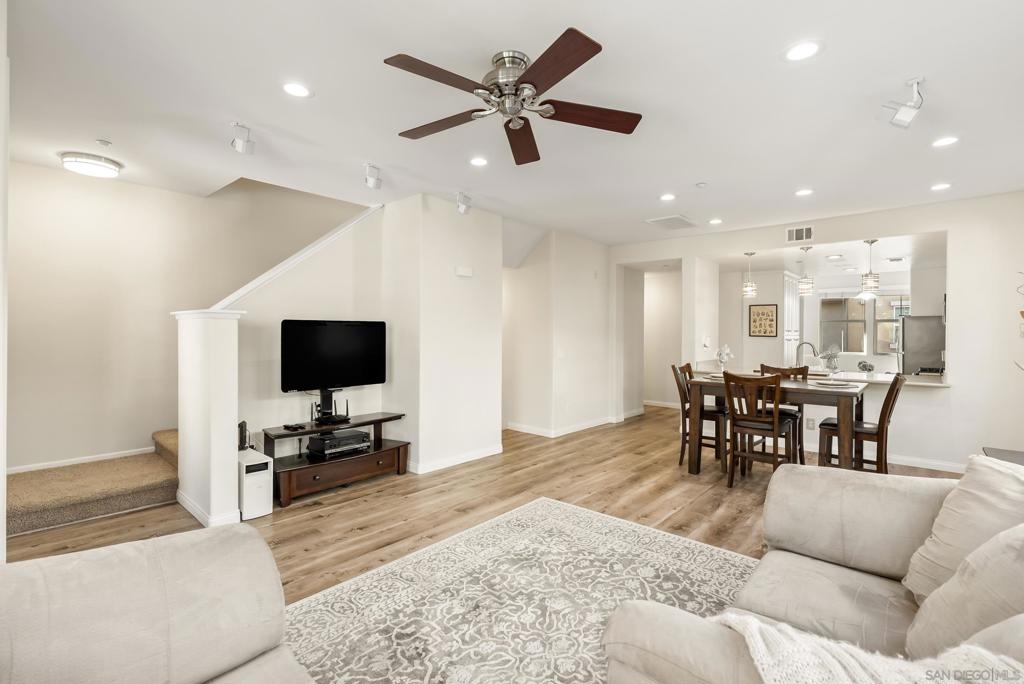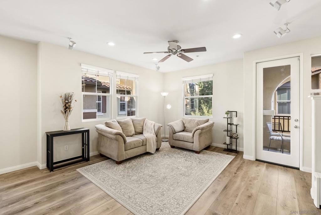 Welcome home to a peaceful and thoughtfully designed townhome in the Morningside Villa Community of Santee. This contemporary tri-level offers 4 bedrooms and 4 bathrooms along with an open plan living/dining area on the main floor. Move-in ready, with fresh paint, updated hardwood flooring, master tiling and recessed lighting. Quiet end unit boasts additional windows, providing extra light and cross-breeze. Enjoy a versatile, first level bedroom and en-suite bath. Entertain with ease in the open-plan second level, where the kitchen, dining, living room and covered balcony flow seamlessly into one another. The cheery kitchen extension can be used as a breakfast nook, another office or a nice spot to kick up your feet and read. Another generously sized bedroom and bath are nestled into the corner on this floor. Enjoy your own retreat in the upstairs primary suite which includes a private balcony, walk in closet, luxurious soaking tub, separate shower and dual sinks. An additional bright bedroom on this floor is also en suite. Attached two-car garage, lower level laundry room, updated appliances and ceiling fans in every room add to the convenience and comfort of this beautiful home. Residents enjoy access to community amenities such as a sparkling pool, spa, picnic and BBQ area, and children's play equipment. With its scenic surroundings and well-maintained facilities, Morningside Villa is a place you'll love to come home to!