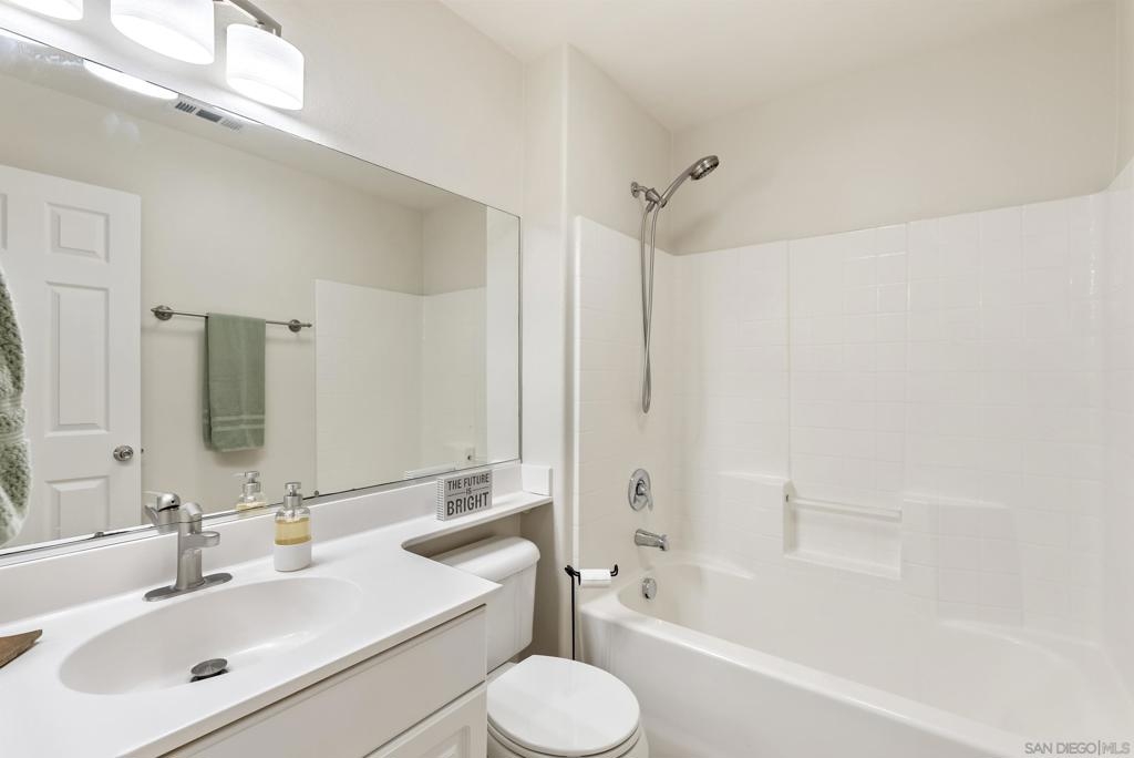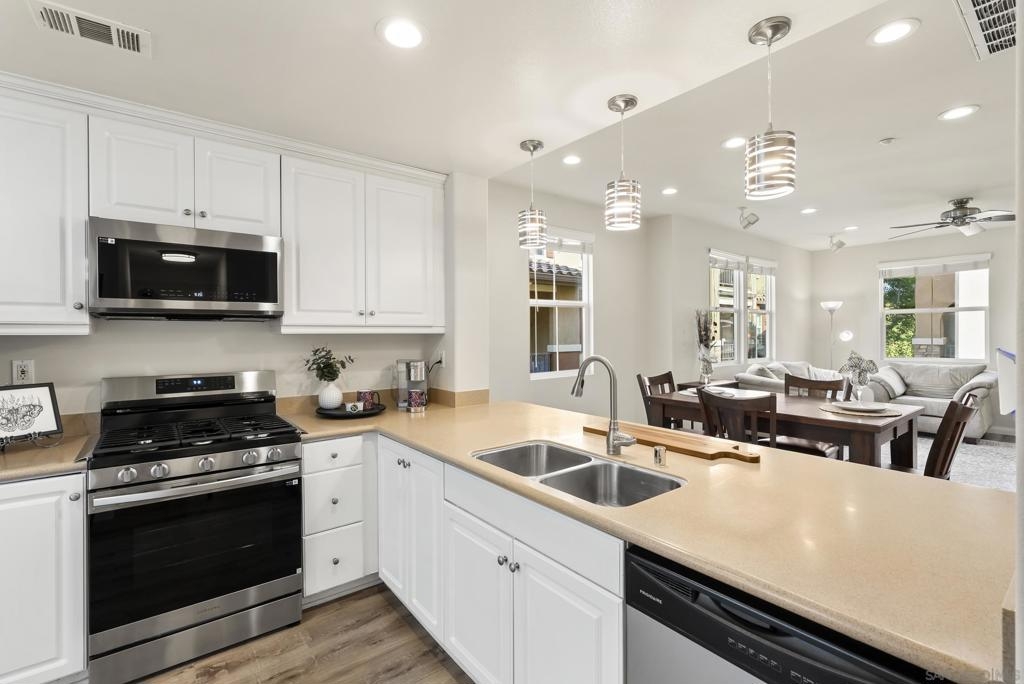 Welcome home to a peaceful and thoughtfully designed townhome in the Morningside Villa Community of Santee. This contemporary tri-level offers 4 bedrooms and 4 bathrooms along with an open plan living/dining area on the main floor. Move-in ready, with fresh paint, updated hardwood flooring, master tiling and recessed lighting. Quiet end unit boasts additional windows, providing extra light and cross-breeze. Enjoy a versatile, first level bedroom and en-suite bath. Entertain with ease in the open-plan second level, where the kitchen, dining, living room and covered balcony flow seamlessly into one another. The cheery kitchen extension can be used as a breakfast nook, another office or a nice spot to kick up your feet and read. Another generously sized bedroom and bath are nestled into the corner on this floor. Enjoy your own retreat in the upstairs primary suite which includes a private balcony, walk in closet, luxurious soaking tub, separate shower and dual sinks. An additional bright bedroom on this floor is also en suite. Attached two-car garage, lower level laundry room, updated appliances and ceiling fans in every room add to the convenience and comfort of this beautiful home. Residents enjoy access to community amenities such as a sparkling pool, spa, picnic and BBQ area, and children's play equipment. With its scenic surroundings and well-maintained facilities, Morningside Villa is a place you'll love to come home to!