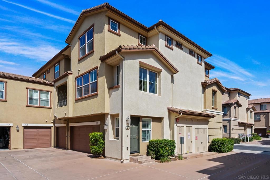 Are you ready to step into your dream home? Look no further than this exceptional property at Northstar at Sky Ranch-1215 Calabria. The open & bright floor plan offers an abundance of natural light through large windows, creating a welcoming & airy atmosphere with the added option of plantation shutters. The kitchen features beautiful dark wood cabinetry, granite countertops, a large breakfast bar. High-quality wood laminate flooring adorns the living & dining areas & newer high quality carpeting upstairs. Adjacent to the kitchen, you'll find a spacious dining area that leads to a covered balcony, providing a perfect spot for relaxing with your favorite beverage anytime of the day or night. A convenient powder room is also located on the mid level. The well appointed dual master suites ensure the comfort, convenience, & privacy of all who come to stay. This exceptional property includes an attached oversized two-car garage with extra storage space, laundry, tankless water heater, water softening system, storage cabinets, tool rack, & overhead storage rack. Just steps from the front door, you will find a large community swimming pool with a spa, stunning sunset views, barbeque areas, clubhouse, & a playground. Additionally, there are owned solar panels, abundant guest parking immediately adjacent to the unit, & the HOA provides earthquake insurance for added peace of mind. Conveniently located with quick & easy access to nearby freeways 52, 67, 125, & interstate 8, this property offers both luxury, style, & convenience.