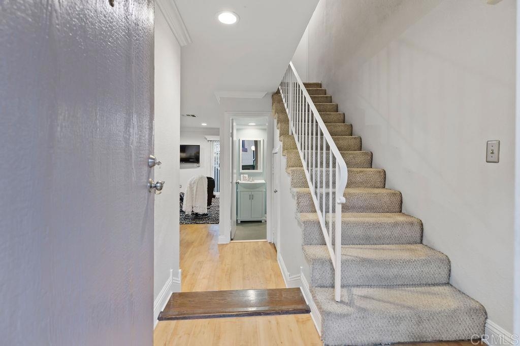 You will love this spacious 1,017 sq. ft. 2-bedroom, 2.5-bathroom updated townhome with large two car garage and in-unit laundry! The kitchen has been remodeled with newer stainless steel appliances, gorgeous cabinets, and an island with an open floor plan to the dining and living room areas. Custom crown molding lines the living room and entryway with all new energy efficient windows and sliding door, motion sensor light switches, under cabinet lights in the kitchen, new living room fan, and extra ceiling lights installed in the kitchen and living room areas to provide ample lighting at night. Both bedrooms are oversized with walk in closets and large windows. The bathrooms have been updated with new toilets, vanities, and flooring making this a turn key home. The balcony has a nice view of the mountains, and is BBQ ready! The garage has plenty of additional storage space with built in cabinets and can be accessed from the unit. Enjoy the community pool that offers gorgeous views of the surrounding area. This home is located in the desirable gated Riderwood Terrace community and is minutes from Santee Trolley Square and the 52 and 67 highways. The home is perfectly priced to welcome it's new owners with all its charm.