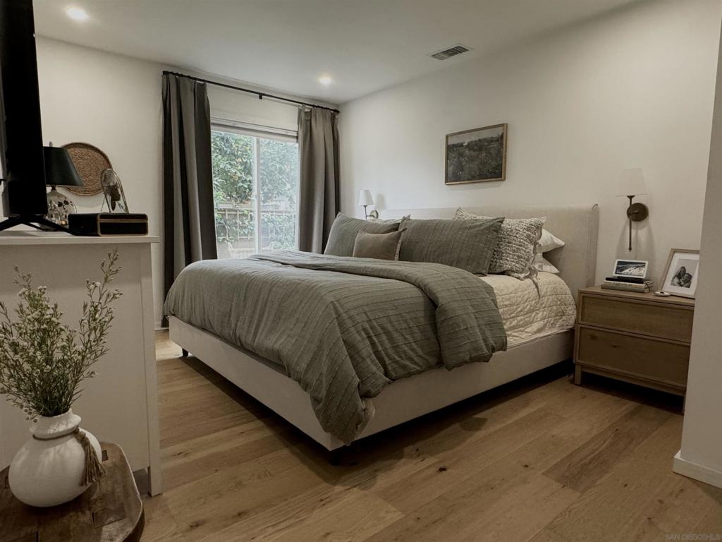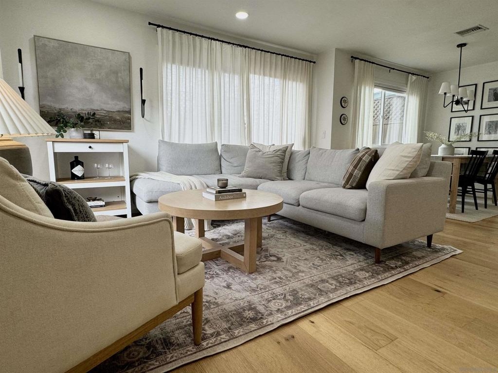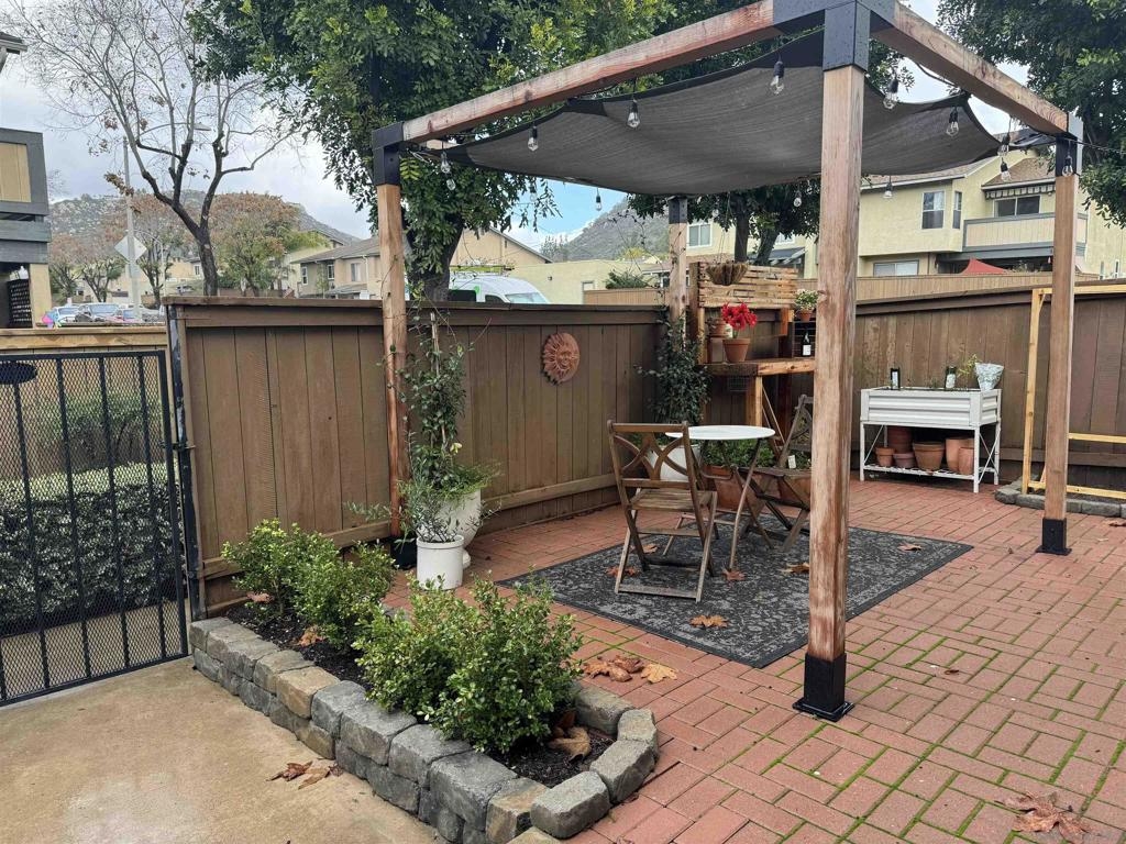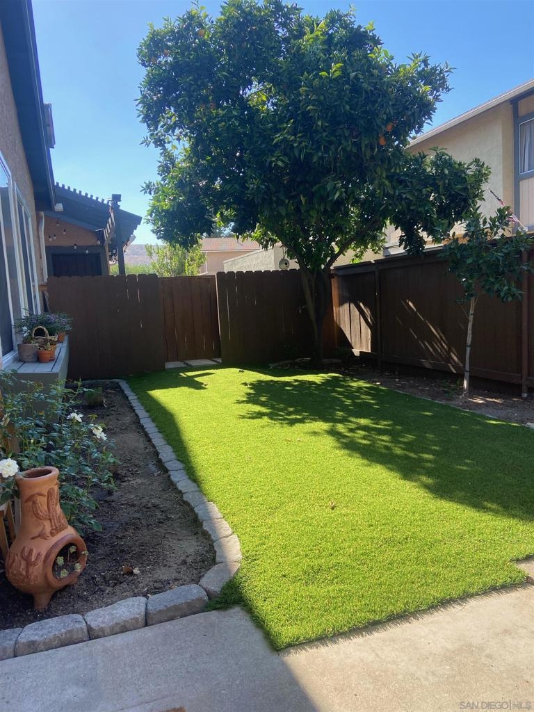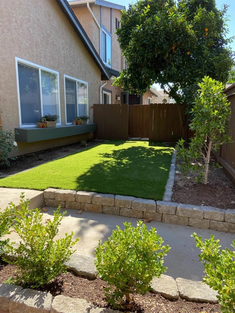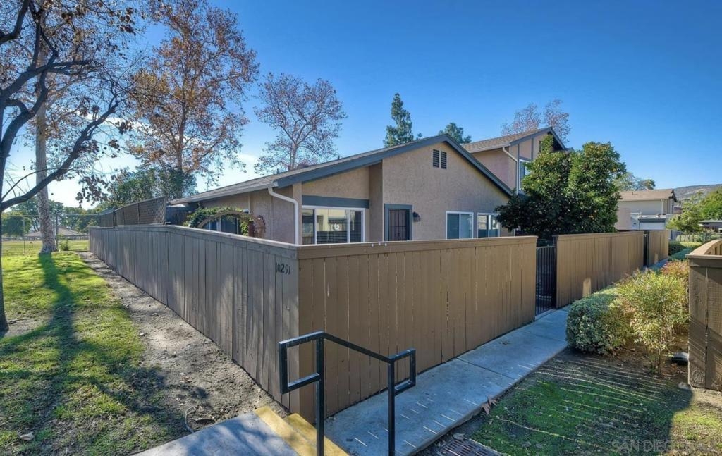 Gorgeous inside and out!Single story end unit townhome on a quiet street in Santee. Pride of ownership shines in every nook an cranny of this special one of a kind unit. You will be hard pressed to find anything else like this townhome on the market today. Spa like bathroom boasts an enormous custom tiled shower with glass doors, brass fixtures and huge seat with multiple faucet fixtures.Marble countertop with bamboo wood vanity, ship lap walls and updated fixtures. Walk in pantry/laundry space with upgraded tankless water less than two years old. Walk in closet in primary bedroom with custom built ins. Large primary suite with large vinyl window. Engineered hardwood floors throughout are beautiful and well maintained. Kitchen is stunning with custom cabinets brass hardware stainless steel appliances, quartz countertops, amazing tiled backsplash with handmade tumbled subway tiles. Step outdoor to welcoming artificial turf lawn & a mature orange tree which produces enough for your friends and family. Stack black retaining wall walk way and flower beds with newly planted landscaping. This is an entertaining yard that wraps around the east side of the home. Build in composting bun as well as fenced are for your trash cans make for a very thought out yard space.Central AC/Heat with google friendly recessed lights. Single car detached garage with additional assigned parking space as well as ample street parking right outside.Community pools, playgrounds and parks are within feet of this unique home. Within walking distance to schools, shops and restaurants to enjoy! A true gem!