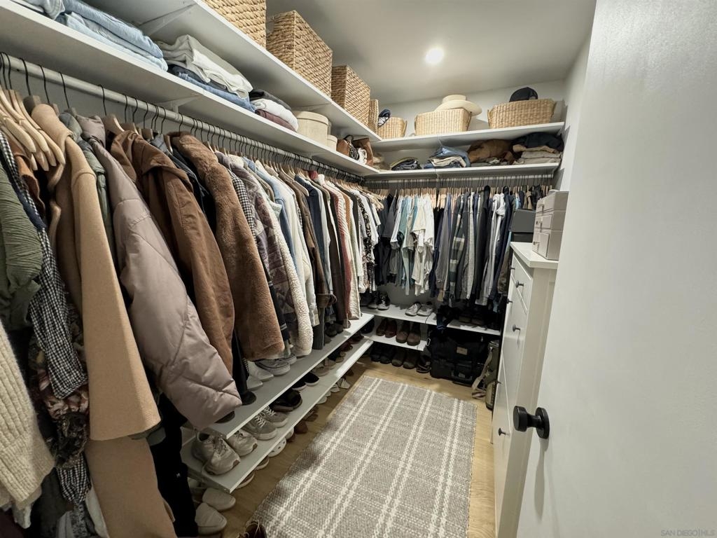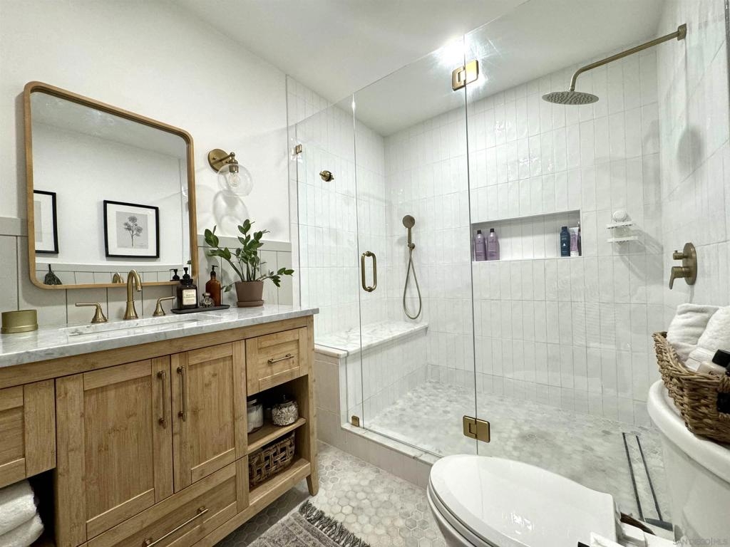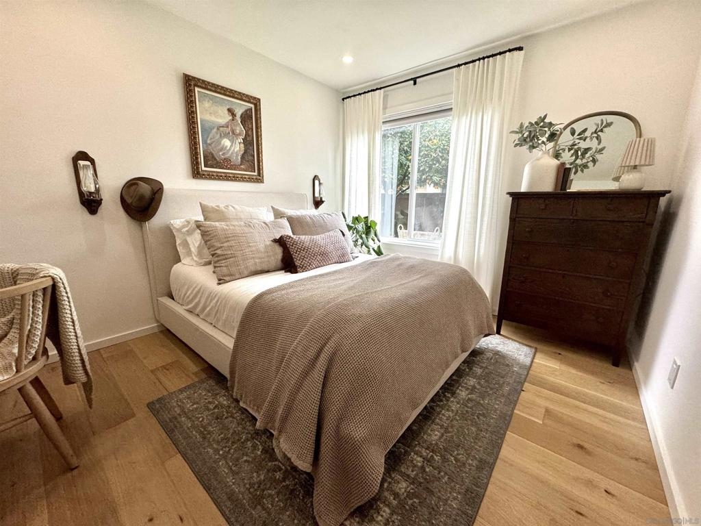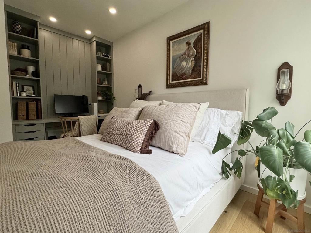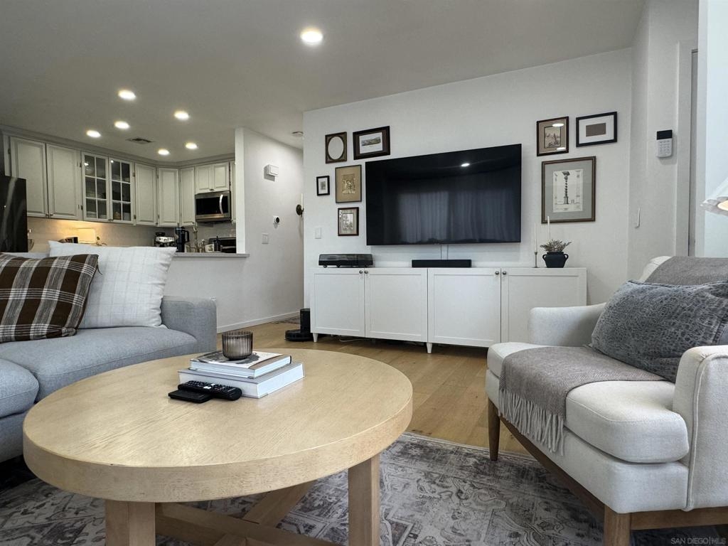 Gorgeous inside and out!Single story end unit townhome on a quiet street in Santee. Pride of ownership shines in every nook an cranny of this special one of a kind unit. You will be hard pressed to find anything else like this townhome on the market today. Spa like bathroom boasts an enormous custom tiled shower with glass doors, brass fixtures and huge seat with multiple faucet fixtures.Marble countertop with bamboo wood vanity, ship lap walls and updated fixtures. Walk in pantry/laundry space with upgraded tankless water less than two years old. Walk in closet in primary bedroom with custom built ins. Large primary suite with large vinyl window. Engineered hardwood floors throughout are beautiful and well maintained. Kitchen is stunning with custom cabinets brass hardware stainless steel appliances, quartz countertops, amazing tiled backsplash with handmade tumbled subway tiles. Step outdoor to welcoming artificial turf lawn & a mature orange tree which produces enough for your friends and family. Stack black retaining wall walk way and flower beds with newly planted landscaping. This is an entertaining yard that wraps around the east side of the home. Build in composting bun as well as fenced are for your trash cans make for a very thought out yard space.Central AC/Heat with google friendly recessed lights. Single car detached garage with additional assigned parking space as well as ample street parking right outside.Community pools, playgrounds and parks are within feet of this unique home. Within walking distance to schools, shops and restaurants to enjoy! A true gem!