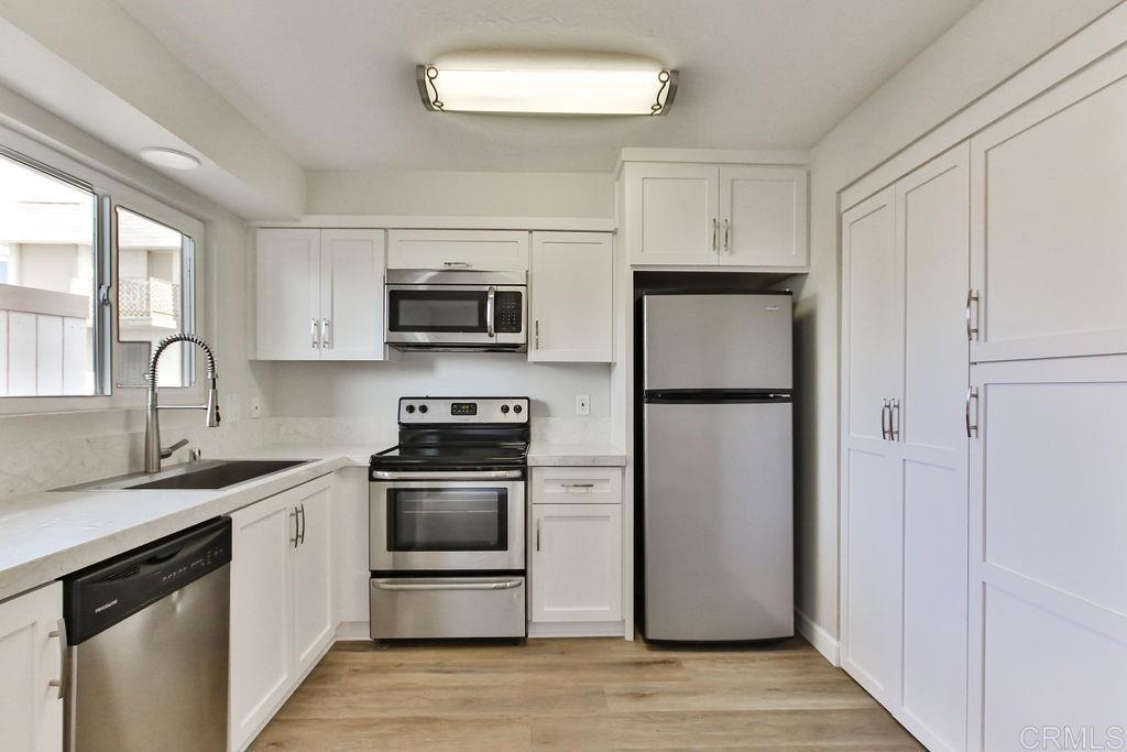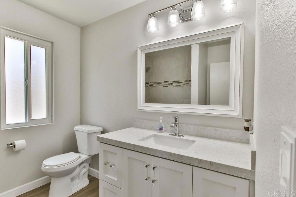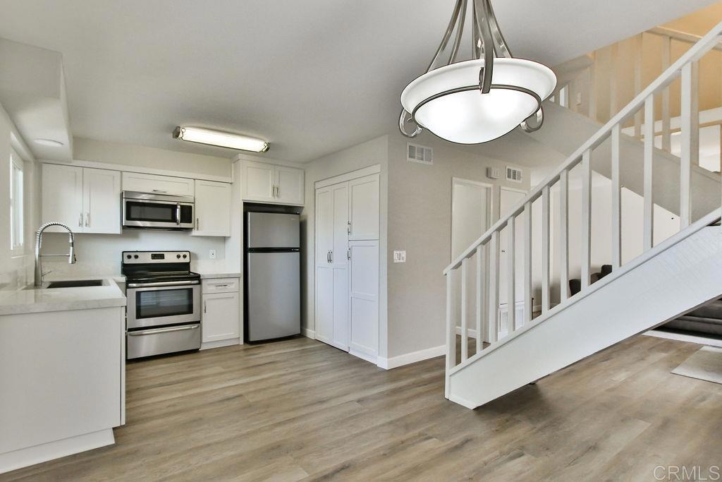 FHA and VA approved! Perfectly located in a smaller HOA with just 55 units in Santee you will find this beautifully renovated 3 bedroom, 1.5 bathroom condo. Recent updates include gorgeous luxury vinyl plank wood look flooring, brand new kitchen cabinets with quartz countertops, a farmhouse style sink and stainless steel appliances. All of the windows are dual pane and the bathrooms have also been updated to include new cabinets, countertops and fixtures. The community includes a wonderful open space for your outdoor enjoyment, a community pool and dog walk. This home includes one assigned, uncovered parking space and in unit laundry. All three bedrooms are upstairs with one bathroom & the guest bathroom can be found on the main level with the living room and dining room. The HOA fees are $332/month and include water.