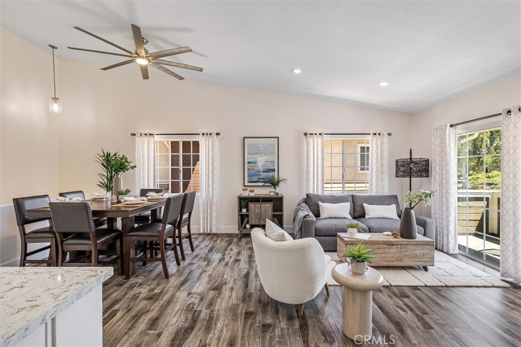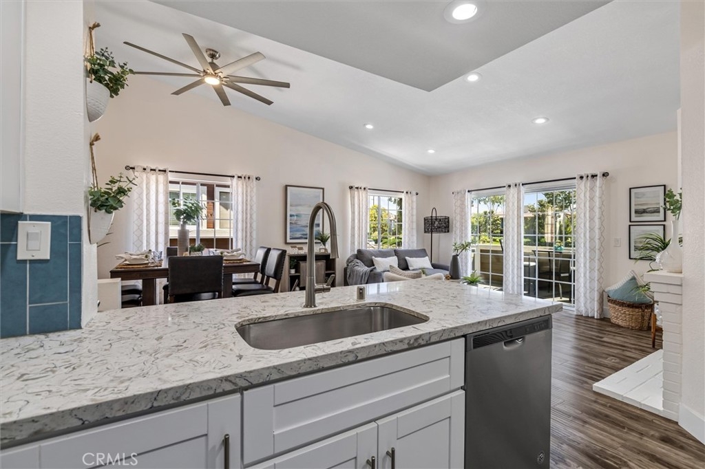 Welcome to this delightful and sunny townhome! As you step inside, a cozy carpeted staircase leads you to the main living area, which features vaulted ceilings. The open-concept design seamlessly connects the living area to the kitchen and dining rooms. The kitchen is beautifully equipped with stainless steel appliances, a lovely tile backsplash, bright white cabinets, and quartz countertops. The entire home boasts fresh paint, new carpeting, and newer luxury vinyl planking, creating a modern and inviting ambiance. You'll find two spacious bedrooms, each with large closets and large windows that fill the rooms with natural light. The primary bedroom includes its own full bathroom, and an additional full bath is conveniently located down the hallway. There's ample storage throughout the home, including a coat closet at the entry and a spacious closet off the deck. For your convenience, a newer front-loading full-size washer and dryer are included and located in the laundry closet in the hallway, and the direct access garage leads right into the entry. The community itself is an oasis, with lushly landscaped greenbelts and pathways that wind through the neighborhood, leading you directly to the clubhouse, pool, spa, and a charming bridge over fountains. Enjoy the nearby River Walk, Santee Lakes Recreation Preserve, proximity to La Jolla and more! Welcome home!