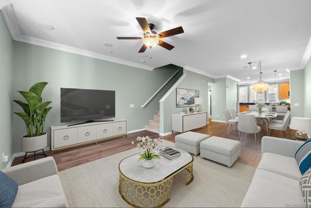 Light and bright townhome in the heart of the Treviso community in West Santee. Natural light pours through the open concept floor plan that flows seamlessly through each level. As you walk in, you will find an abundance of space throughout the home, including the dual-primary suites, full sized laundry room, attached 2 car garage, and an optional room that can be customized in any way—an office, guest room, or cozy den. Custom upgrades include designer paint and crown molding, flooring, window shutters, and light fixtures. Step outside and enjoy the resort style pool and clubhouse, or take a short walk to the expansive Mission Trails Regional Park. Don’t miss your chance at this beautifully designed home!