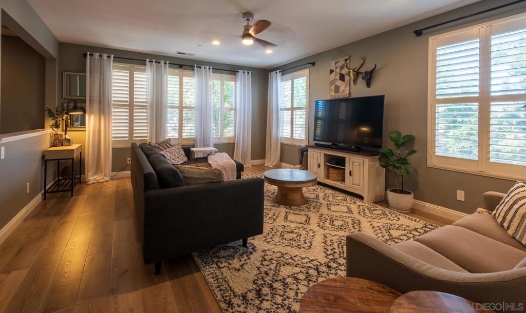 Don't miss this rarely available Riverwalk 4 bedroom, 3-1/2 bathroom home that shows like a model! This coveted corner location is the largest in the community as one of the "book-end" floorplans. Being on the quiet side next to the lush greenbelt provides a lot of privacy. Enjoy outdoor space on the front deck or the balcony off of the kitchen with views of the hills in the distance. This home has many upgrades, including: high end laminate flooring, quartz countertops, white shaker soft close cabinets, Kohler farmhhouse sink, designer paint, black hinges and knobs, plantation shutters throughout, tasteful window coverings (which convey), custom shelving, tankless water heater and walk-in pantry! SEE SUPPLEMENT for more! There's more to share about this amazing home! You will enjoy a light & bright open floorplan on the main living area (living room, kitchen, dining room, breakfast area & half bathroom). Downstairs (at the garage level) there are 2 bedrooms & a full bathroom. The top floor features the master bedroom & bathroom plus another bedroom with an ensuite bathroom. The kitchen was remodeled in 2020 & laminate flooring installed in the main living area, stairs and upstairs. Berber carpet replaced in the downstairs bedrooms in 2020. Riverwalk features a pool, spa, tot lot & rec center! This is a wonderful central Santee neighborhood where you can walk to Rio Seco Elementary School, & Santana HS. Right across the street is the YMCA, Santee Aquatic Center, Community Park & Sportsplex. This family friendly community offers fun events in the park, including live concerts & fireworks in the Summer. Low HOA & No Mello Roos! Welcome Home! Sewer: Sewer Connected Topography: LL