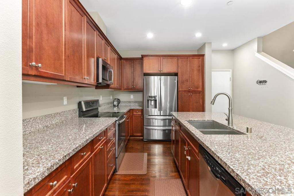 This wonderful townhome centrally located in the Mission Trails Collection offers an open-concept main level with a modern kitchen, granite countertops, and stainless steel appliances. The first level includes a spacious bedroom and a full bathroom. Upstairs, find two more bedrooms, a full-sized bathroom, and a laundry room. The master suite features a custom walk-in closet and a bathroom with double sinks. The home is energy-efficient with a fully paid-off solar system, upgraded flooring, Nest Smart Thermostat, extra storage, and a two-car garage. Located near Mission Trails Regional Park, with easy freeway access and proximity to San Diego and Santee amenities. Turn-key ready!