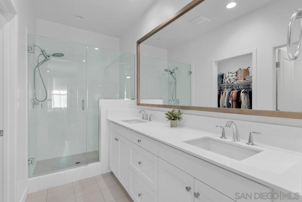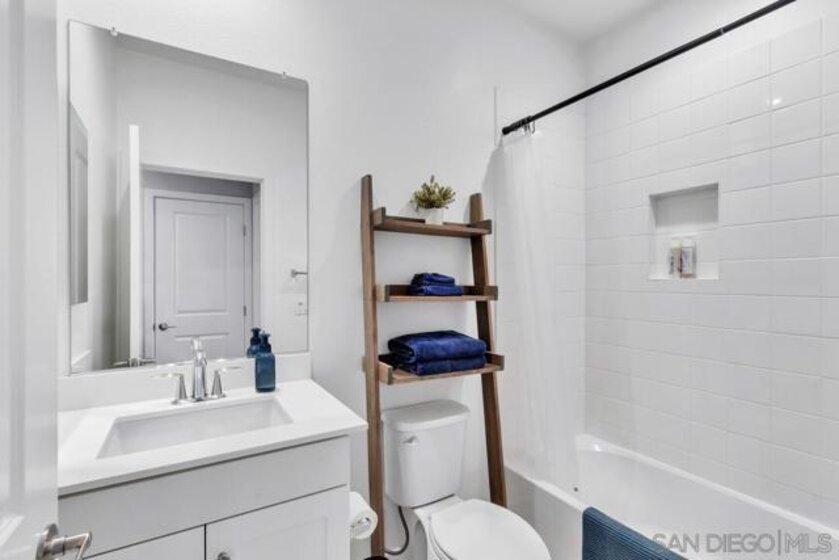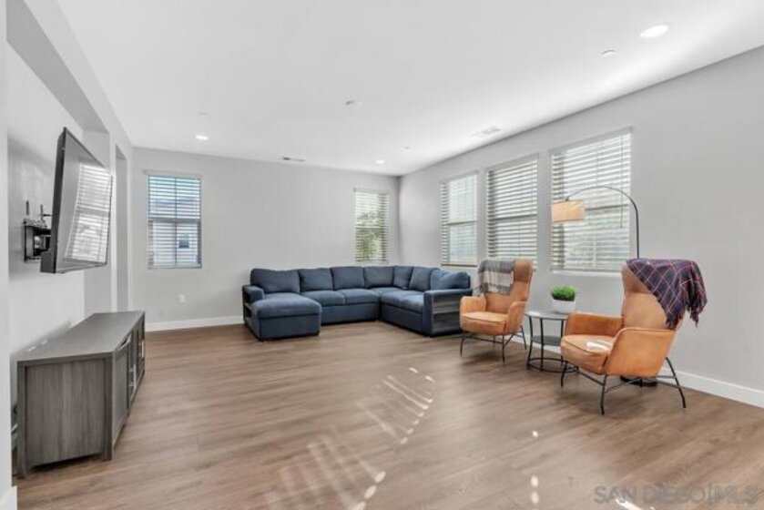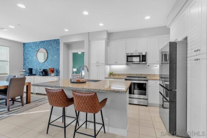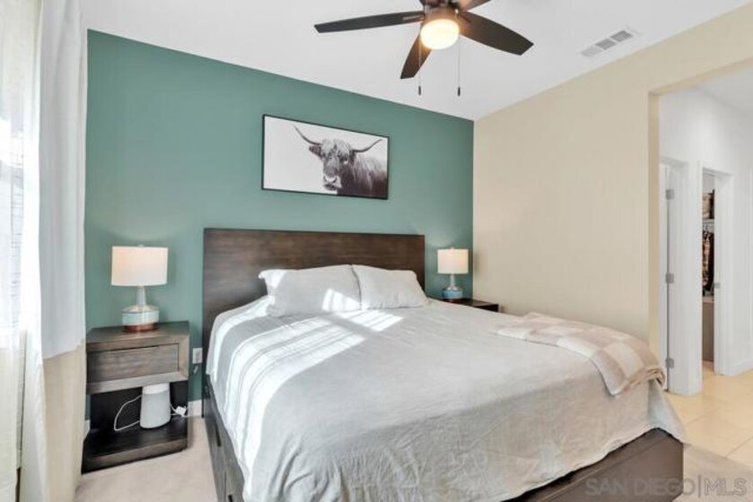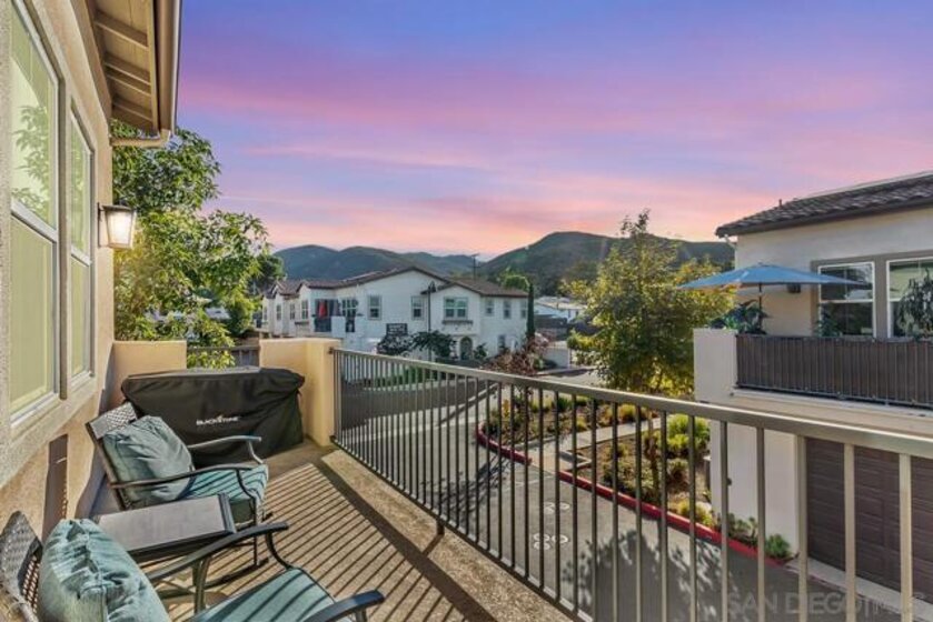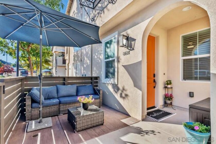 Welcome to the Ariana community. This end-unit townhome, built in 2020, has been beautifully maintained and features 3 bedrooms and 3 bathrooms, blending modern design, comfort, and eco-friendly upgrades. Enjoy an open-concept living space with brand-new LVP flooring, plush carpeted bedrooms, and plenty of natural light. The gourmet kitchen features an induction stove and under-sink alkaline water system, and connects seamlessly to the spacious dining and living areas — perfect for entertaining or relaxing at home. The primary suite offers a walk-in closet, while the first-floor bedroom, which also includes a walk-in closet, provides flexibility for guests or a home office. Step outside to your west-facing porch with beautiful mountain views, or enjoy your private front yard with turf and stamped concrete patio. This home is packed with smart and sustainable features, including 6 owned solar panels, 2 Tesla batteries, and 8 additional panels, giving you peace of mind to run your A/C freely. Additional highlights include a whole-house fan, Nest thermostat, and fiber-optic internet. The attached two-car garage offers convenient storage racks, and residents can enjoy a low monthly HOA with community amenities such as barbecue areas and corn hole. Ideally located near Mission Trails, Cowles Mountain, major shopping centers, and many restaurants — this home is a perfect fit for today’s lifestyle.
