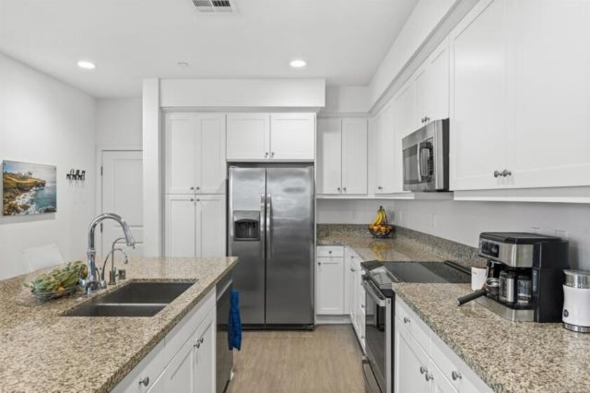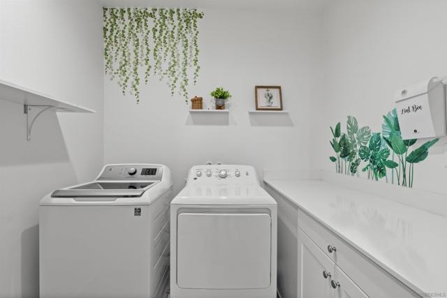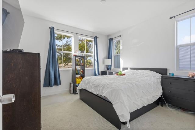 Built in 2020, this modern 4-bedroom home offers a bright, open floor plan with 9’ ceilings and vinyl plank flooring throughout. The spacious kitchen features a large island, granite countertops, stainless steel appliances, and an instant hot-and-cold water tap.Upstairs, the primary suite includes dual sinks, a walk-in closet, and beautiful sunset views. The convenient upstairs laundry room includes built-in storage and a folding counter. A whole-house fan helps keep the home cool while reducing AC use. Energy efficiency shines with included solar, dual-pane vinyl windows, and a Tesla charging station in the attached 2-car garage. Outside, the fenced-in patio is perfect for BBQs, lined with a fully producing passionfruit vine and offering stunning evening sunsets. Located on the outskirts of the community, this home provides extra privacy and ample guest parking right nearby. All of this in a peaceful neighborhood with a low HOA, just 5 minutes to the 52 and 125 freeways and 10 minutes to Costco, Target, Sprouts, Trader Joe’s, and more—within a top-rated school district. Move-in ready, stylish, private, and energy efficient—this home truly has it all.