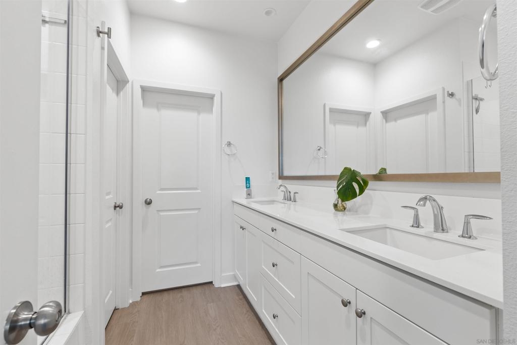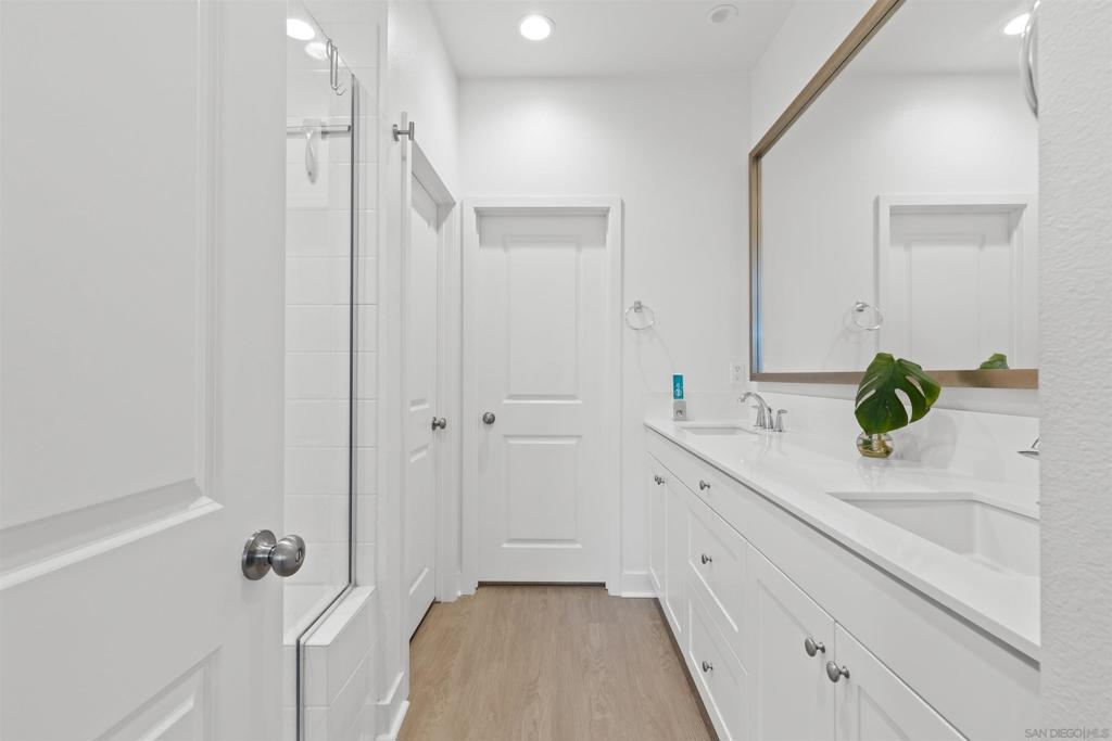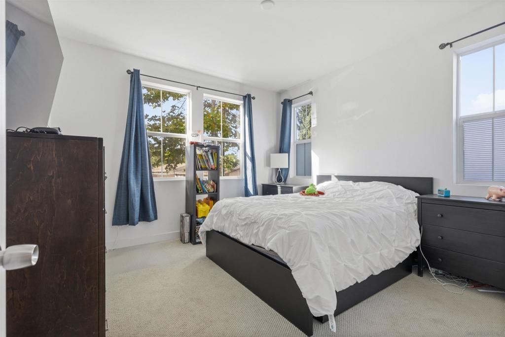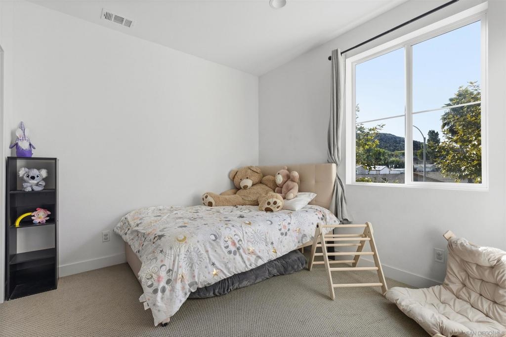 Where modern design, everyday comfort, and an exceptional location come together, this turnkey, move-in-ready home truly offers it all. The open-concept first floor features 9’ ceilings, vinyl plank flooring, and a stylish kitchen with a large granite island, stainless steel appliances, and an instant hot/cold water tap. A downstairs bedroom and full bath provide flexible living options for guests or a home office. Enjoy added privacy and abundant nearby guest parking, along with a fenced front yard featuring turf, mature trees, and a fully producing passionfruit vine. The 2-car garage with Tesla charger adds modern convenience. Upstairs, the primary suite offers a walk-in closet, dual sinks, and sunset views, with additional bedrooms and upstairs laundry. Built in 2020 ensures all of the energy-efficient features including fully paid solar, dual-pane windows, a whole-house fan, and central AC. Ideally located near the 52 and 125 freeways, minutes from Costco, Target, Sprouts, Trader Joe’s, so many restaurants etc and the trails and streambeds of Mission Trails. A rare end-unit offering privacy, style, and location—this home must be seen in person to be fully appreciated.