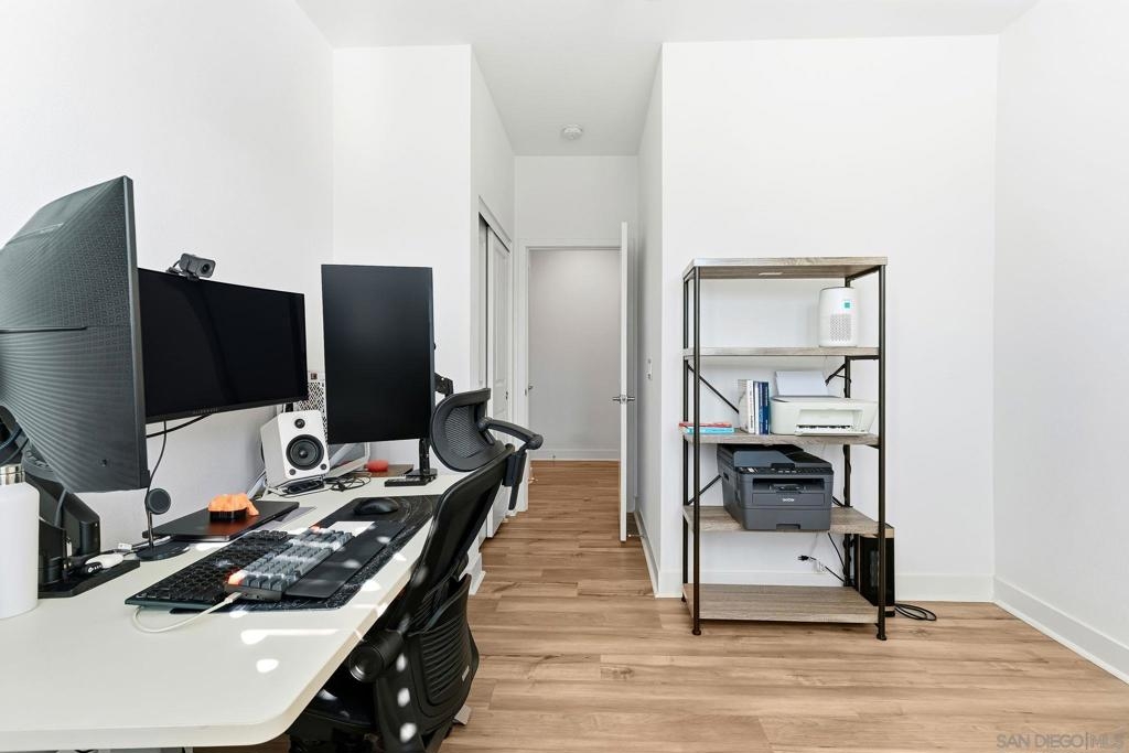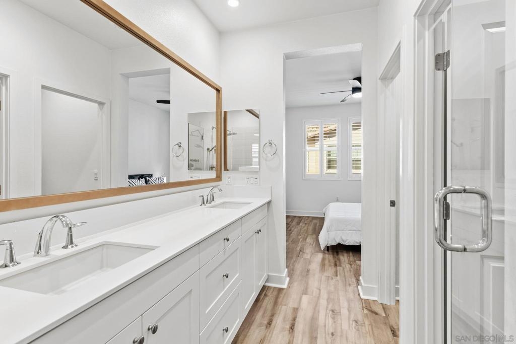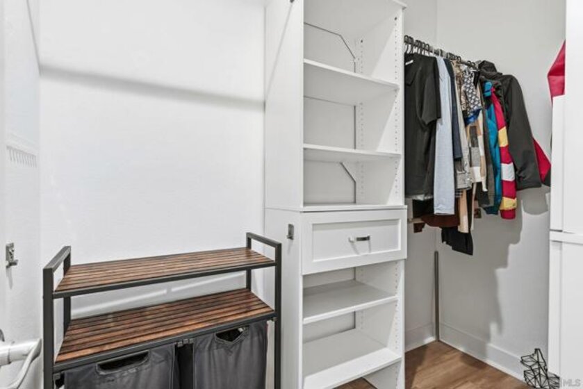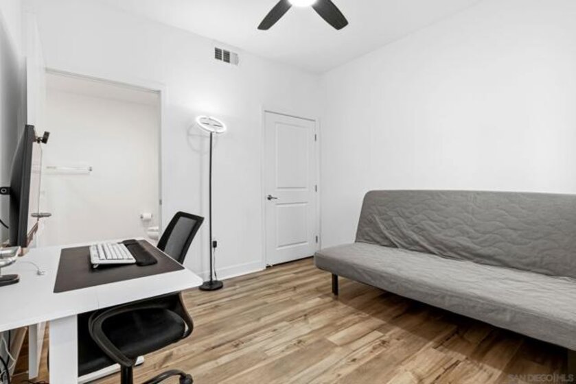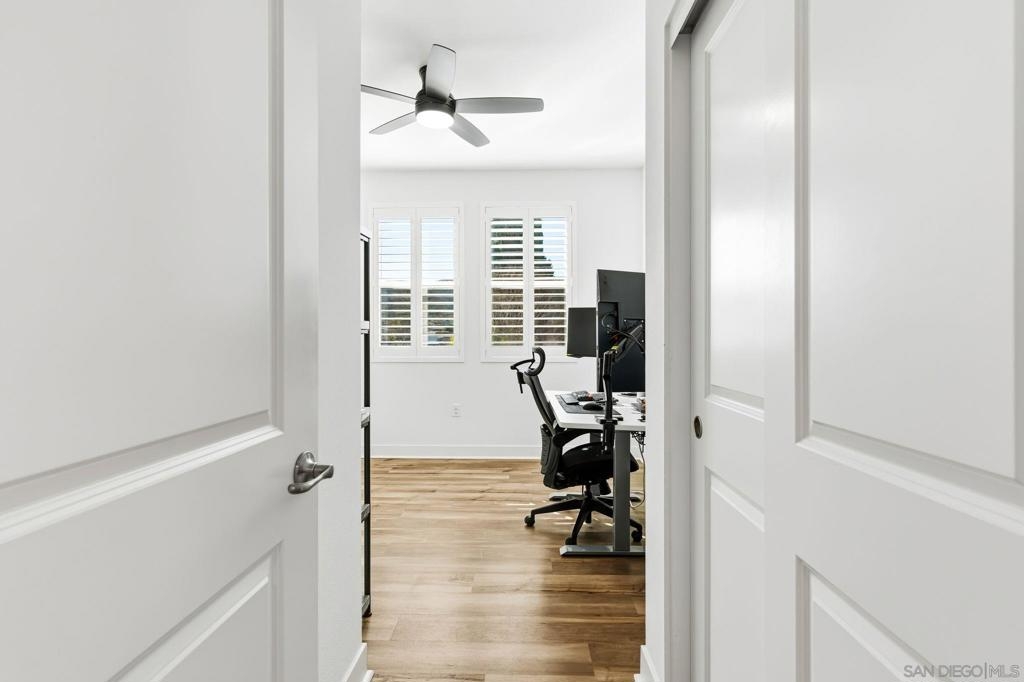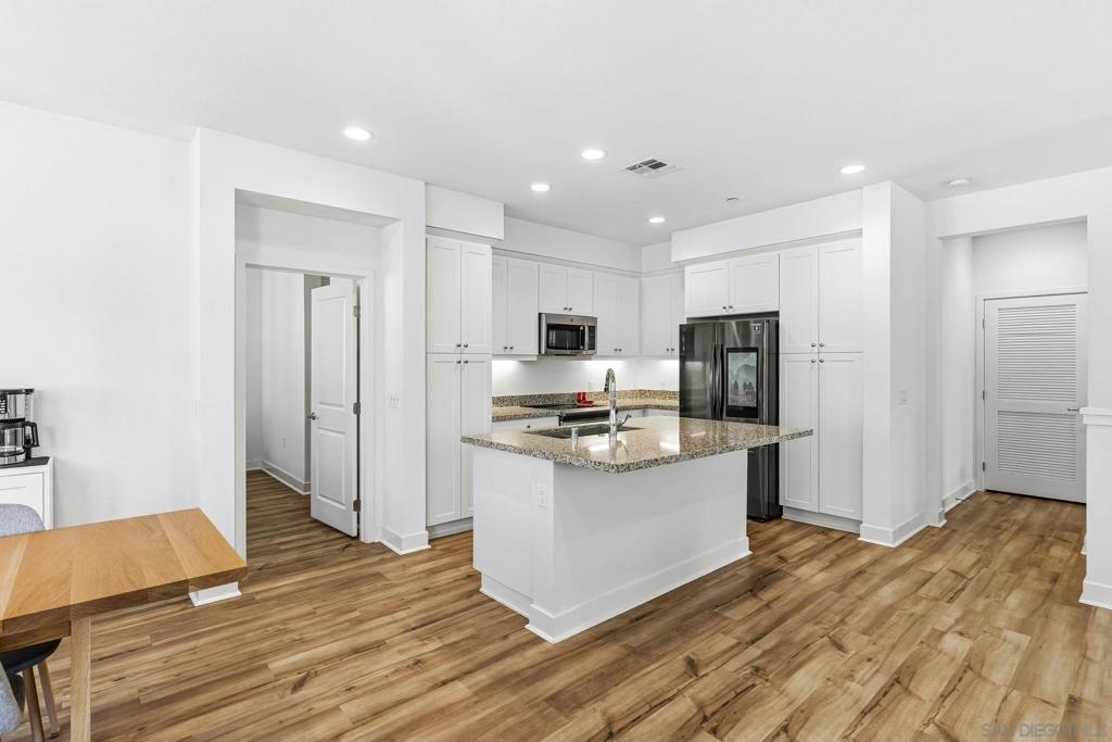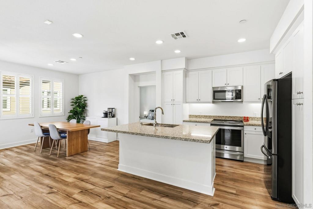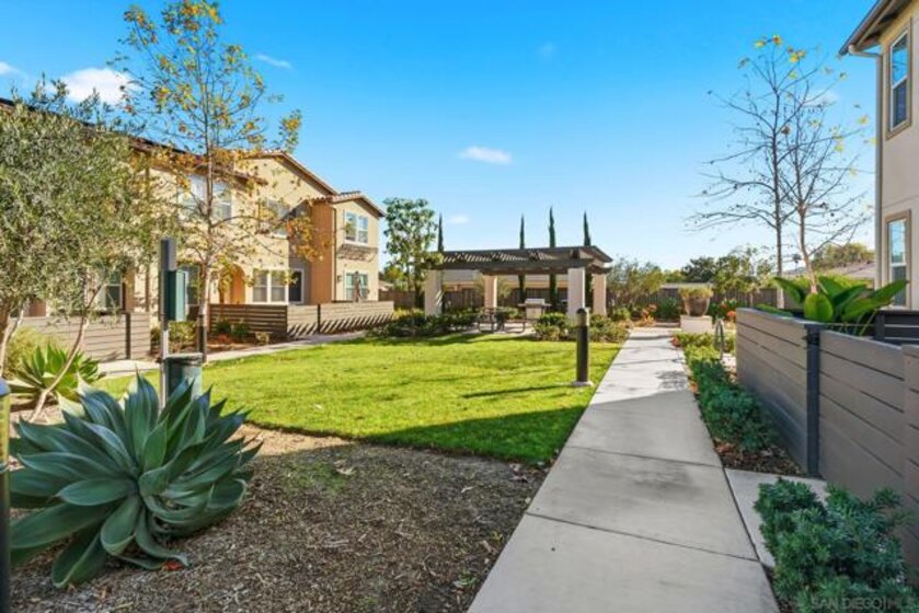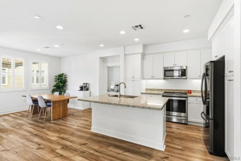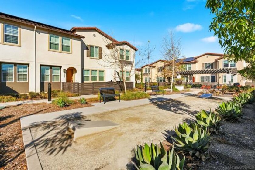 Tucked within one of Santee’s most desirable townhome communities, this pristine and private end-unit residence blends modern contemporary design, functional living, and thoughtful upgrades, offering a rare opportunity to own in a neighborhood where homes rarely hit the market. Featuring three bedrooms and an ideal, highly functional floor plan, this home includes a first-floor bedroom complete with a full bathroom and walk-in closet, flexible for an in-law suite, guest retreat, home office, or private gym. Upstairs, you’re welcomed into a grand open-concept living space filled with natural light and framed by beautiful mountain views. The spacious kitchen showcases stunning granite countertops, stainless steel appliances, and a smart refrigerator with touchscreen functionality, so cool that it allows you to view visitors at your door through the Ring camera right from the fridge display, blending luxury with everyday convenience. The expansive primary suite offers a peaceful space for relaxation, complete with an en-suite bathroom and a walk-in closet featuring custom built-ins. Step outside to the oversized balcony, uniquely positioned for added privacy and backing to scenic mountain landscapes. Additional upgrades include newly installed turf, with space to add raised garden beds perfect for crafting a peaceful outdoor extension of the home, ceiling fans throughout, and brand-new epoxy garage flooring. Enjoy eco-friendly living and impactful monthly savings with owned solar panels. Just outside your front door, the community offers a charming seating area, cornhole games, and a BBQ space, great for hosting gatherings or enjoying relaxed evenings outdoors. Ideally located within walking distance to Mission Trails, Cowles Mountain, near multiple shopping centers, dining options, and with convenient freeway access, this home places all of San Diego within easy reach. Blending contemporary style, comfort, and practicality, this exceptional residence presents a rare opportunity to live in one of Santee’s most desirable communities.